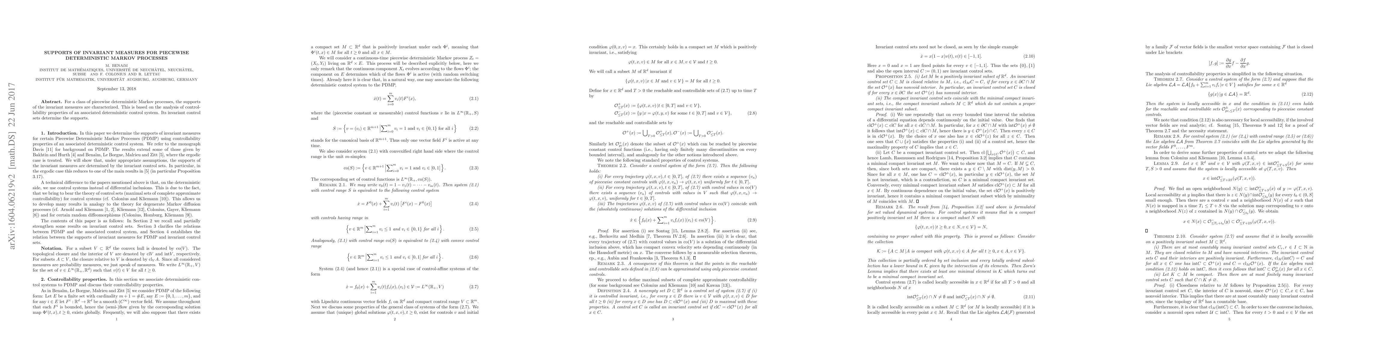 Summary: This paper characterizes the supports of invariant measures for a class of piecewise deterministic Markov processes, utilizing the controllability properties of an associated deterministic control system, where invariant control sets define the supports.