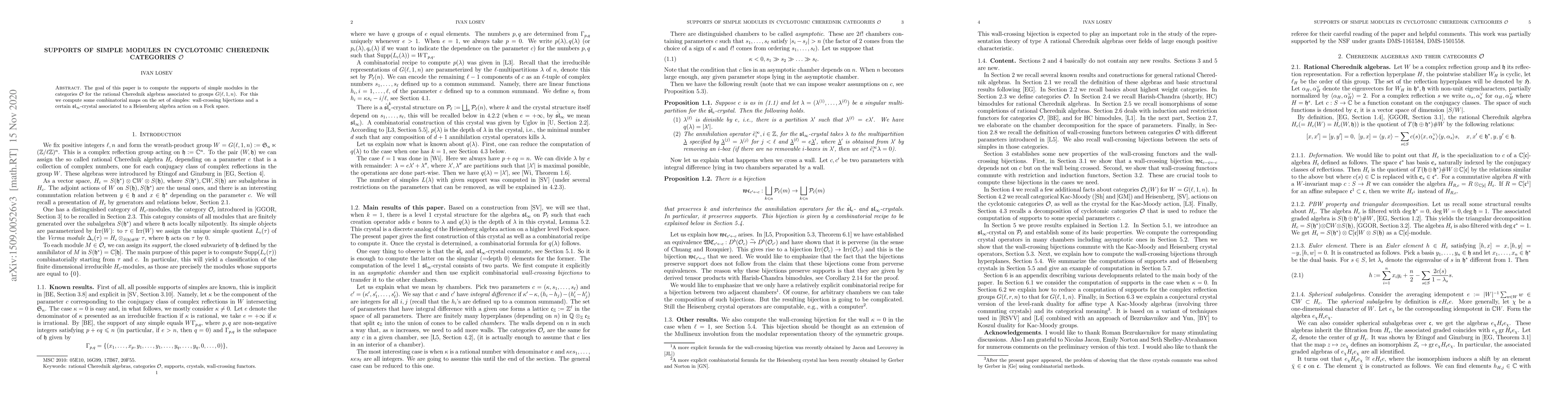 The goal of this paper is to compute the supports of simple modules in the categories $\mathcal{O}$ for the rational Cherednik algebras associated to groups $G(\ell,1,n)$. For this we compute some combinatorial maps on the set of simples: wall-crossing bijections and a certain $\mathfrak{sl}_\infty$-crystal associated to a Heisenberg algebra action on a Fock space.