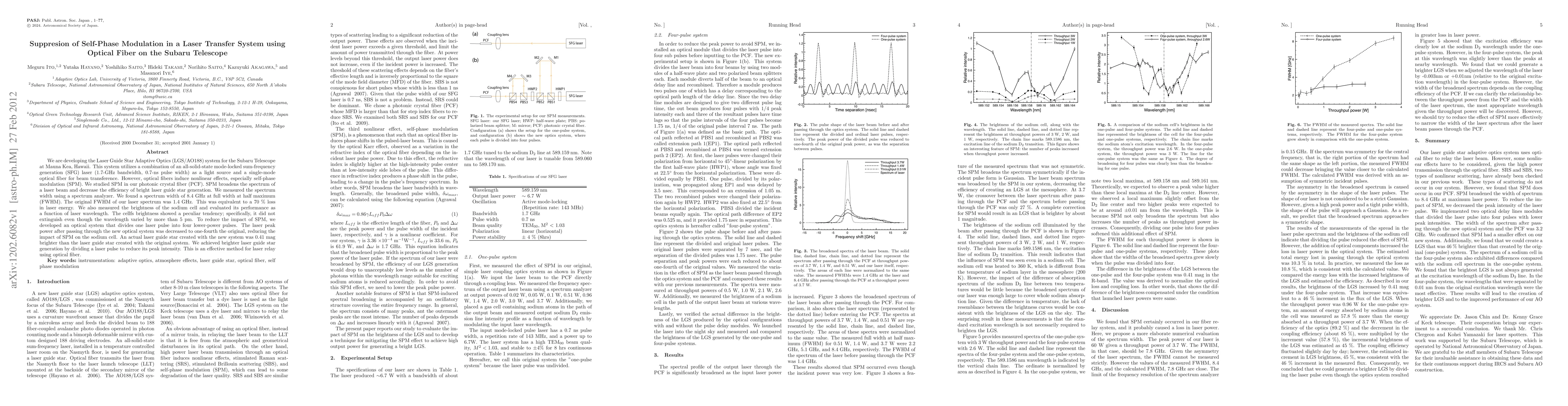 This paper investigates the suppression of self-phase modulation (SPM) in a laser transfer system for the Subaru Telescope's LGS/AO system. By dividing a laser pulse into four lower-power pulses, the system reduces peak intensity and SPM effects, resulting in a 0.41 mag brighter laser guide star compared to the original system.