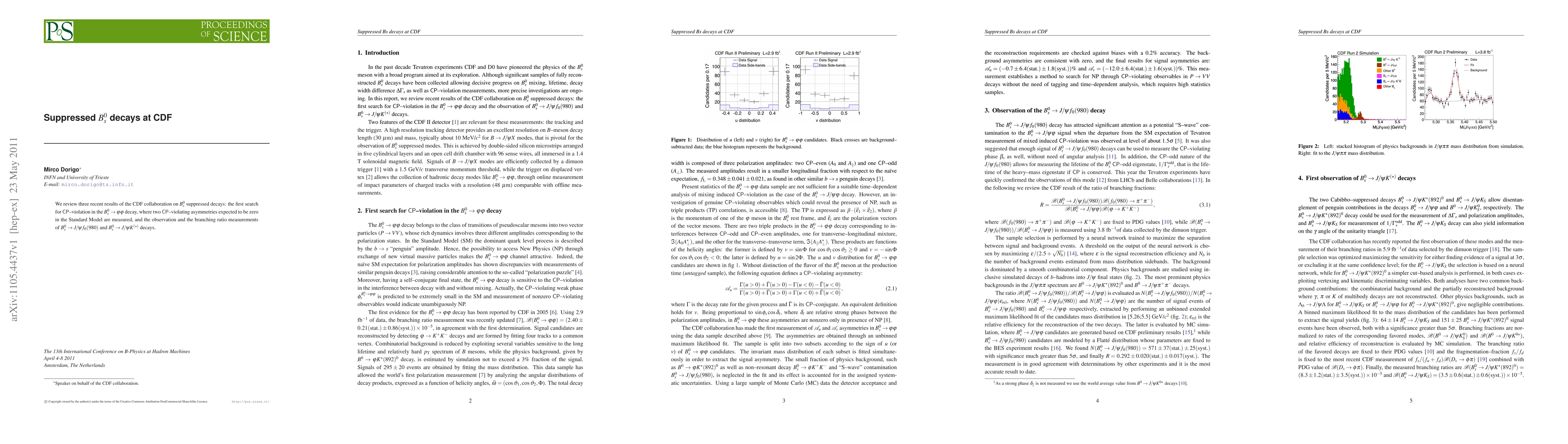 We review three recent results of the CDF collaboration on Bs suppressed decays: the first search for CP--violation in the Bs-->phi phi decay, where two CP--violating asymmetries expected to be zero in the Standard Model are measured, and the observation and the branching ratio measurements of Bs-->jpsi fnot and Bs-->jpsi K(*) decays.