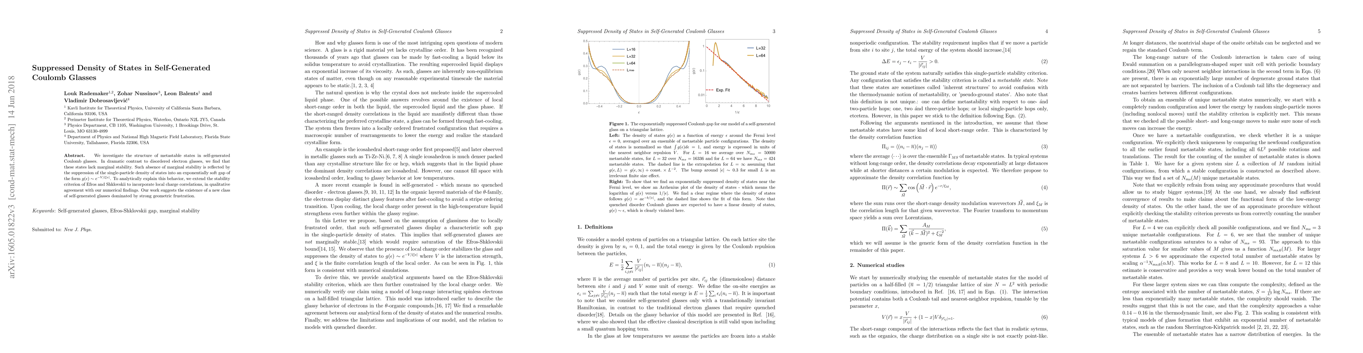 Researchers found that self-generated Coulomb glasses have a unique property: their states lack marginal stability, resulting in an exponentially soft gap in the density of states. This discovery suggests the existence of a new class of glasses dominated by geometric frustration.