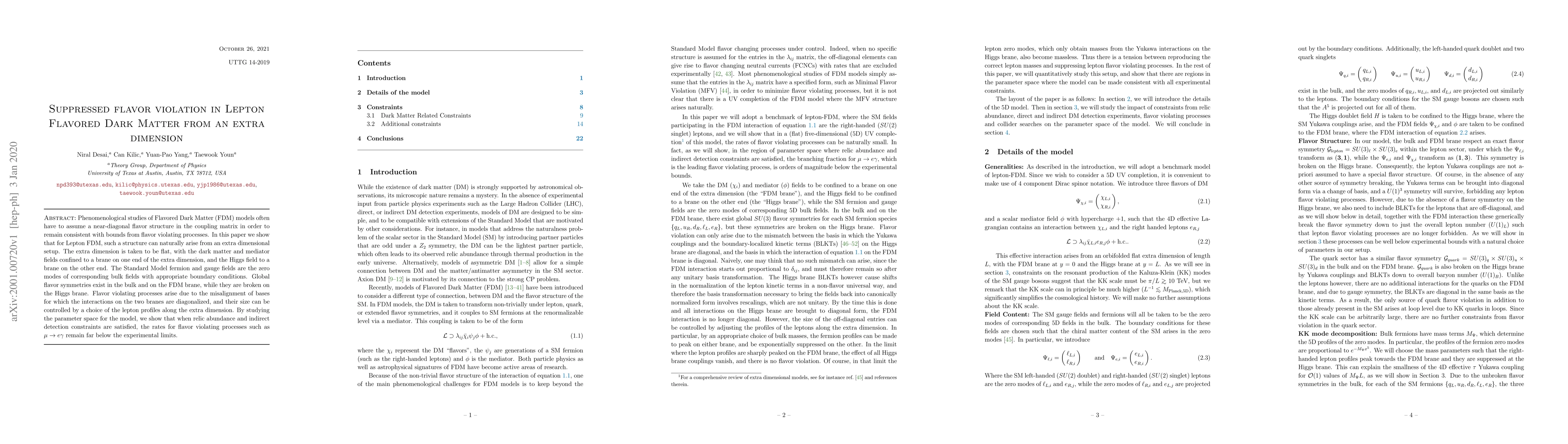 This paper explores how Lepton Flavored Dark Matter (FDM) can naturally exhibit suppressed flavor violation through an extra-dimensional setup, where the dark matter and mediator fields are confined to one brane, and the Higgs field to another, allowing for controlled flavor-violating processes that remain below experimental limits.