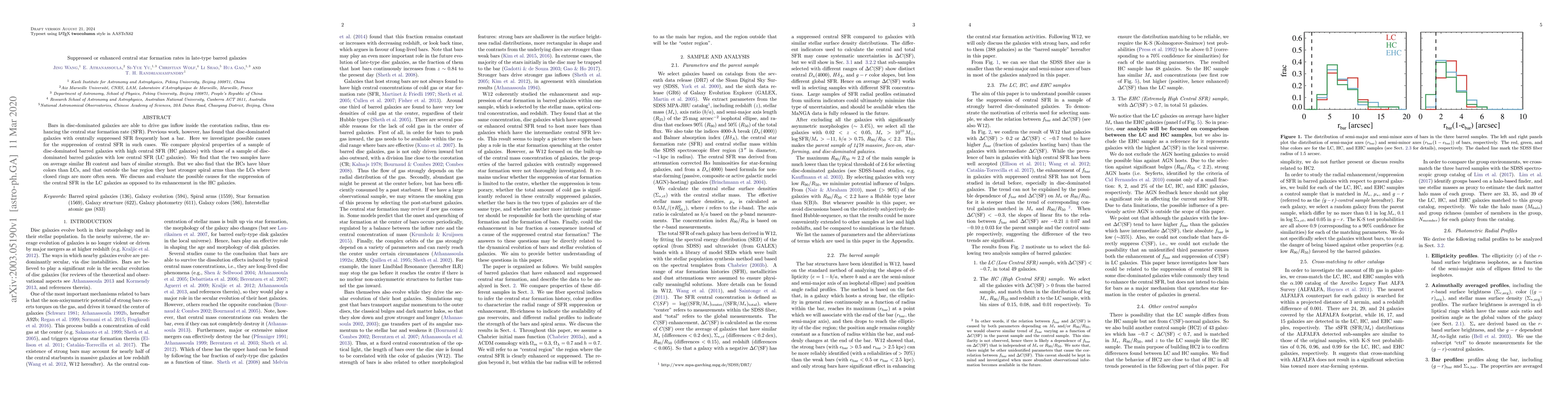 Bars in disc-dominated galaxies are able to drive gas inflow inside the corotation radius, thus enhancing the central star formation rate (SFR). Previous work, however, has found that disc-dominated galaxies with centrally suppressed SFR frequently host a bar. Here we investigate possible causes for the suppression of central SFR in such cases. We compare physical properties of a sample of disc-dominated barred galaxies with high central SFR (HC galaxies) with those of a sample of disc-dominated barred galaxies with low central SFR (LC galaxies). We find that the two samples have on average similar HI content and bars of similar strength. But we also find that the HCs have bluer colors than LCs, and that outside the bar region they host stronger spiral arms than the LCs where closed rings are more often seen. We discuss and evaluate the possible causes for the suppression of the central SFR in the LC galaxies as opposed to its enhancement in the HC galaxies.