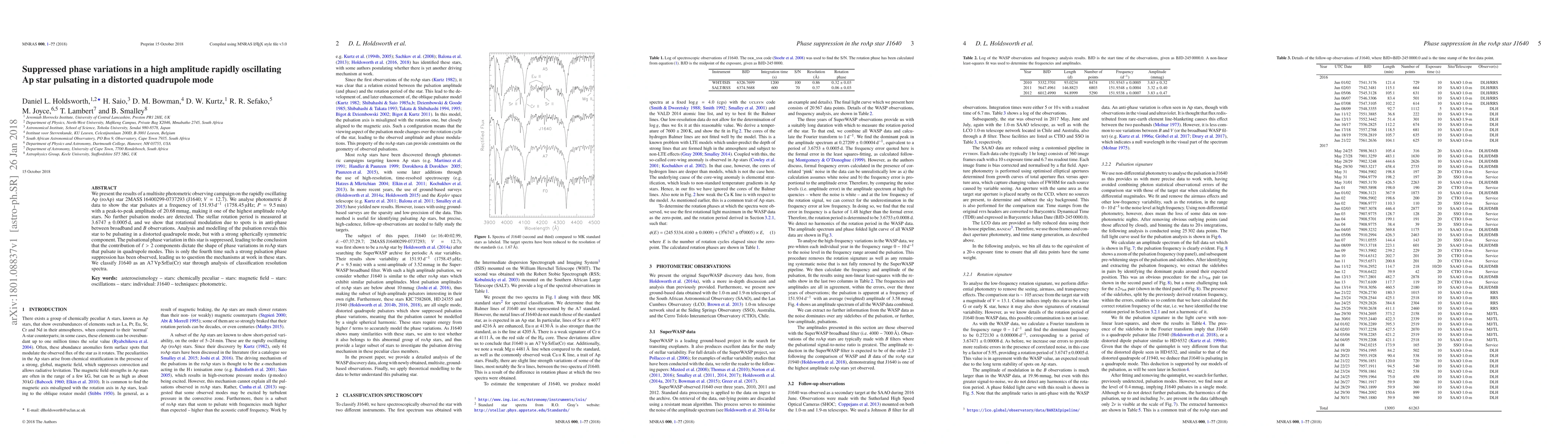 We present the results of a multisite photometric observing campaign on the rapidly oscillating Ap (roAp) star 2MASS 16400299-0737293 (J1640; $V=12.7$). We analyse photometric $B$ data to show the star pulsates at a frequency of $151.93$ d$^{-1}$ ($1758.45 \mu$Hz; $P=9.5$ min) with a peak-to-peak amplitude of 20.68 mmag, making it one of the highest amplitude roAp stars. No further pulsation modes are detected. The stellar rotation period is measured at $3.6747\pm0.0005$ d, and we show that rotational modulation due to spots is in anti-phase between broadband and $B$ observations. Analysis and modelling of the pulsation reveals this star to be pulsating in a distorted quadrupole mode, but with a strong spherically symmetric component. The pulsational phase variation in this star is suppressed, leading to the conclusion that the contribution of $\ell>2$ components dictate the shape of phase variations in roAp stars that pulsate in quadrupole modes. This is only the fourth time such a strong pulsation phase suppression has been observed, leading us to question the mechanisms at work in these stars. We classify J1640 as an A7 Vp SrEu(Cr) star through analysis of classification resolution spectra.