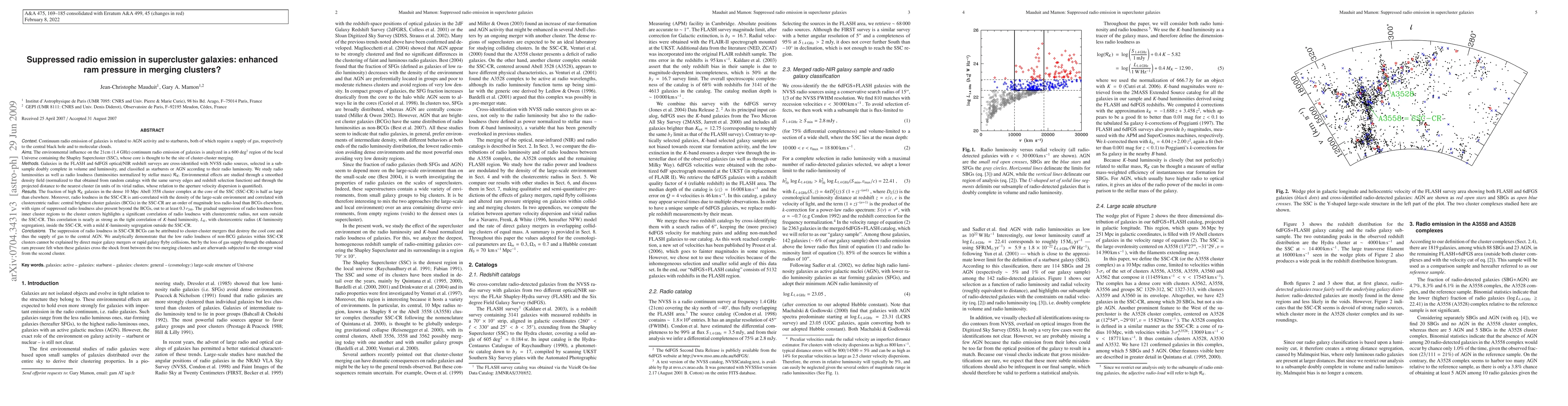 The environmental influence on the 1.4 GHz continuum radio emission of galaxies is analyzed in a 600 deg2 region of the local Universe containing the Shapley Supercluster (SSC). Galaxies in the FLASH and 6dFGS redshift surveys are cross-identified with NVSS radio sources, selected in a subsample doubly complete in volume and luminosity. Environmental effects are studied through a smoothed density field (normalized with random catalogs with the same survey edges and redshift selection function) and the distance to the nearest cluster (R/r200, where r200 is the virial radius, whose relation to the aperture velocity dispersion is quantified). The fraction of high radio loudness (R_K=L_radio/L_K) galaxies in the 10 Mpc Abell 3558 cluster complex at the core of the SSC (SSC-CR) is half as large than elsewhere. In the SSC-CR, R_K is anti-correlated with the density of the large-scale environment and correlated with R/r200: central brightest cluster galaxies (BCGs) in the SSC-CR are 10x less radio-loud than BCGs elsewhere, with signs of suppressed radio loudness in the SSC-CR also present beyond the BCGs, out to at least 0.3 r200. This correlation is nearly as strong as the tight correlation of L_K with R/r200 (K-luminosity segregation), inside the SSC-CR. The suppression of radio loudness in SSC-CR BCGs can be attributed to cluster-cluster mergers that destroy the cool core and thus the supply of gas to the central AGN. We analytically demonstrate that the low radio loudness of non-BCG galaxies within SSC-CR clusters cannot be explained by direct major galaxy mergers or rapid galaxy flyby collisions, but by the loss of gas supply through the enhanced ram pressure felt when these galaxies cross the shock front between the 2 merging clusters and are later subjected to the stronger wind from the 2nd cluster.