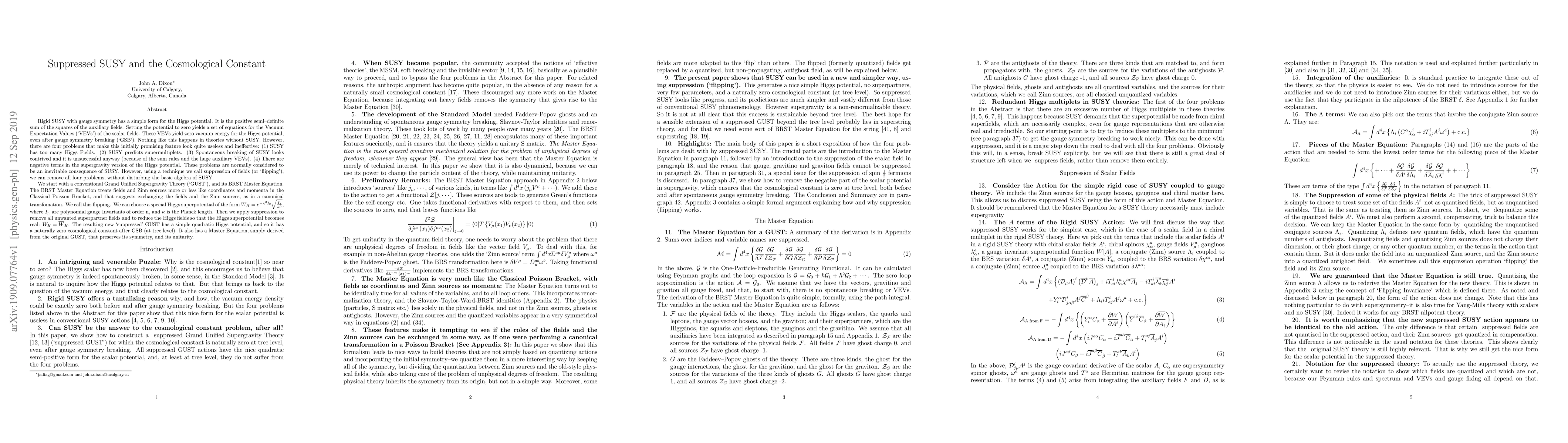 Rigid SUSY with gauge symmetry has a simple form for the Higgs potential. It is the positive semi--definite sum of the squares of the auxiliary fields. Setting the potential to zero yields a set of equations for the Vacuum Expectation Values (`VEVs') of the scalar fields. These VEVs yield zero vacuum energy for the Higgs potential, even after gauge symmetry breaking (`GSB'). Nothing like this happens in theories without SUSY. However, there are four problems that make this initially promising feature look quite useless and ineffective: (1) SUSY has too many Higgs Fields. (2) SUSY predicts supermultiplets. (3) Spontaneous breaking of SUSY looks contrived and it is unsuccessful anyway (because of the sum rules and the huge auxiliary VEVs). (4) There are negative terms in the supergravity version of the Higgs potential. These problems are normally considered to be an inevitable consequence of SUSY. However, using a technique we call suppression of fields (or `flipping'), we can remove all four problems, without disturbing the basic algebra of SUSY. We start with a conventional Grand Unified Supergravity Theory (`GUST'), and its BRST Master Equation. The BRST Master Equation treats fields and Zinn sources more or less like coordinates and momenta in the Classical Poisson Bracket, and that suggests exchanging the fields and the Zinn sources, as in a canonical transfomation. We call this flipping. The resulting new `suppressed' GUST has a simple quadratic Higgs potential, and so it has a naturally zero cosmological constant after GSB (at tree level). It also has a Master Equation, simply derived from the original GUST, that preserves its symmetry, and its unitarity.