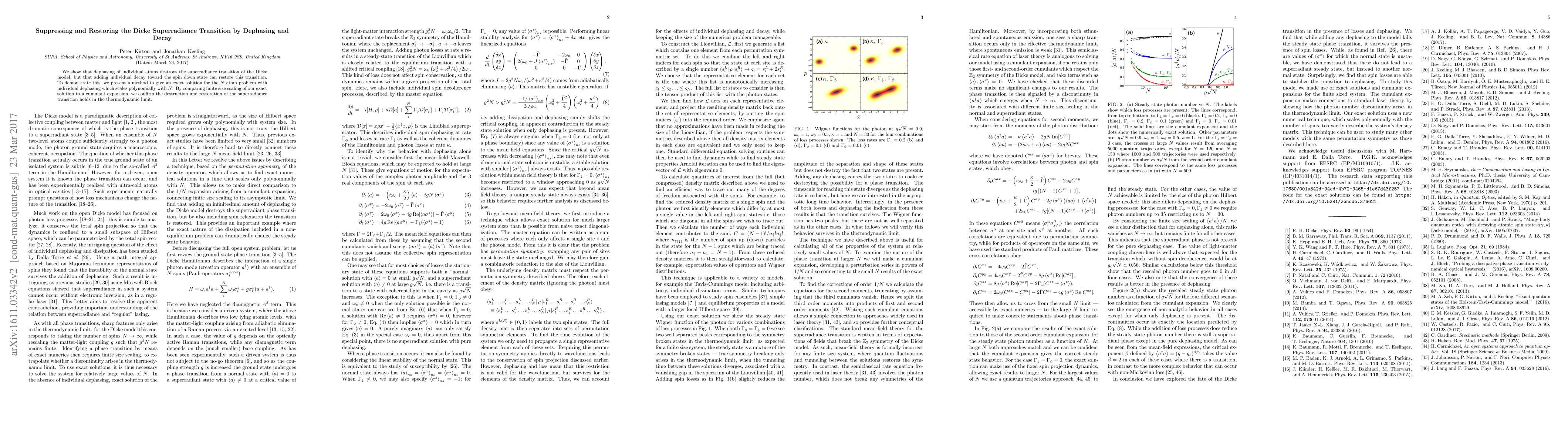 We show that dephasing of individual atoms destroys the superradiance transition of the Dicke model, but that adding individual decay toward the spin down state can restore this transition. To demonstrate this, we present a method to give an exact solution for the $N$ atom problem with individual dephasing which scales polynomially with $N$. By comparing finite size scaling of our exact solution to a cumulant expansion, we confirm the destruction and restoration of the superradiance transition holds in the thermodynamic limit.