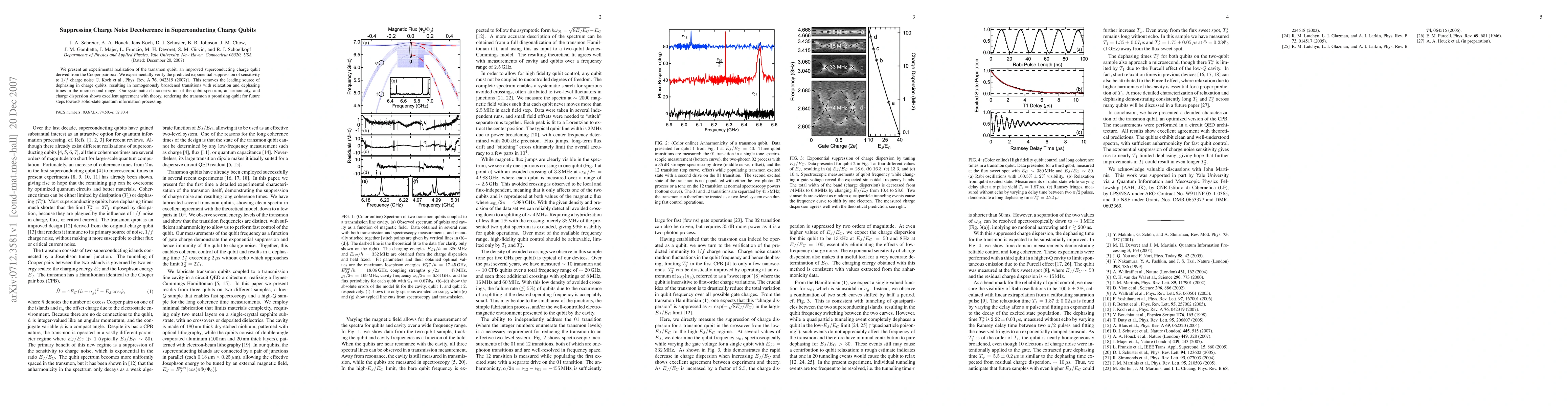 This paper demonstrates the successful implementation of a transmon qubit, which significantly reduces sensitivity to 1/f charge noise compared to traditional charge qubits. The results show improved coherence times, making the transmon a promising candidate for quantum computing applications.