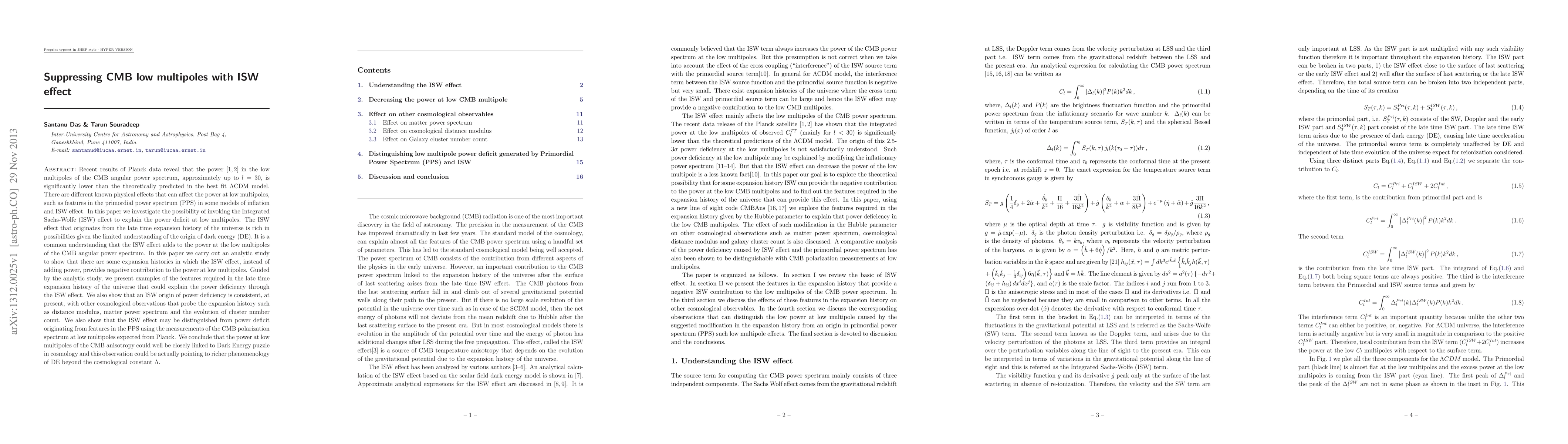 This paper explores the Integrated Sachs-Wolfe (ISW) effect as a potential explanation for the observed power deficit in the low multipoles of the CMB angular power spectrum, suggesting that under certain late-time expansion histories, the ISW effect could provide a negative contribution to this power. It concludes that the ISW effect may offer insights into the nature of dark energy and could be distinguished from other power deficit origins through future CMB polarization measurements.