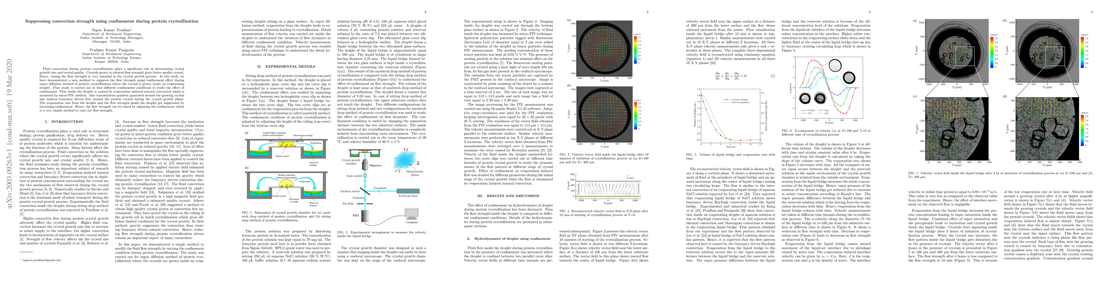 Fluid convection during protein crystallization plays a significant role in determining crystal growth rate and crystal quality. Crystals grown in reduced flow strength gives better quality crystal. Hence, tuning the flow strength is very essential in the crystal growth process. In this work, we have demonstrated a new method to suppress the flow strength using confinement effect during vapor diffusion method of protein crystallization where the crystal is grown inside an evaporating droplet. Flow study is carried out at four different confinement conditions to study the effect of confinement. Flow inside the droplet is caused by evaporation induced natural convection which is measured by micro-PIV method. Also concentration gradient generated around the growing crystal also induces buoyancy driven flow around the protein crystal during the crystal growth phase. The evaporation rate from the droplet and the flow strength inside the droplet get suppressed by increasing confinement. Hence, the flow strength can be tuned by adjusting the confinement which is a very simple method to tune the flow strength.