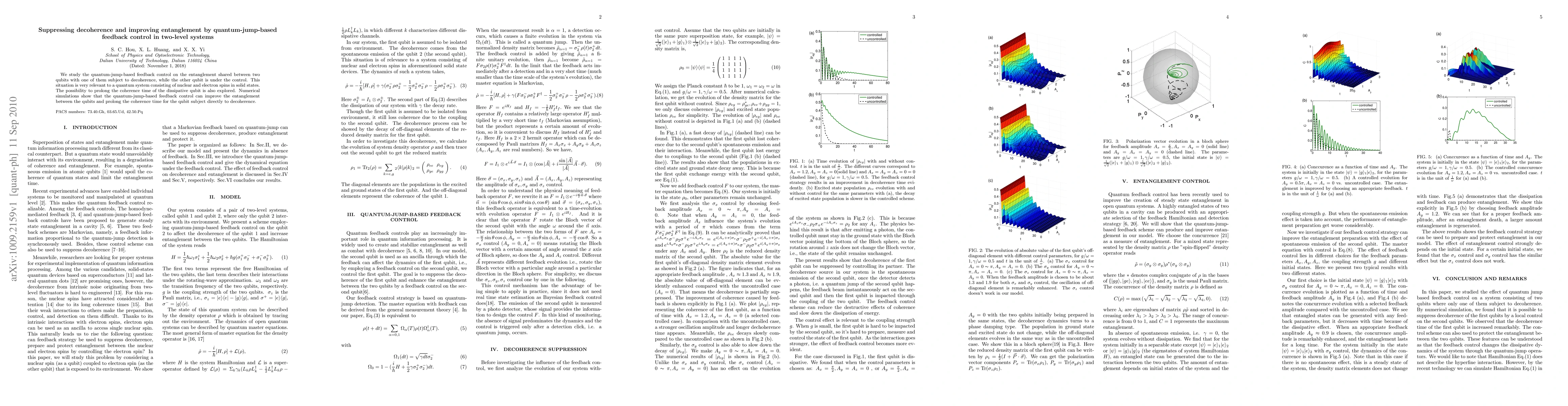 This paper investigates quantum-jump-based feedback control to enhance entanglement and suppress decoherence in two-qubit systems, particularly in solid-state systems with nuclear and electron spins. Numerical simulations demonstrate that this control method can improve qubit entanglement and extend the coherence time of the decohering qubit.