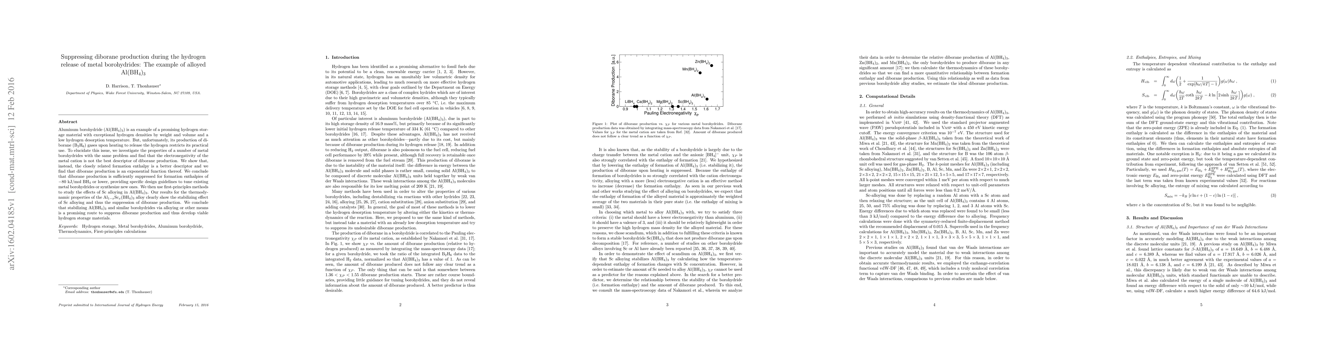This paper investigates the suppression of diborane production in metal borohydrides, particularly aluminum borohydride (Al(BH$_4$)$_3$), which is a promising hydrogen storage material. The study finds that diborane production is better described by the formation enthalpy rather than the metal cation's electronegativity, and that it can be suppressed for formation enthalpies below $-$80 kJ/mol BH$_4$. The paper also demonstrates the stabilizing effect of Sc alloying in Al(BH$_4$)$_3$ using first-principles methods, suggesting alloying as a viable method to develop better hydrogen storage materials.