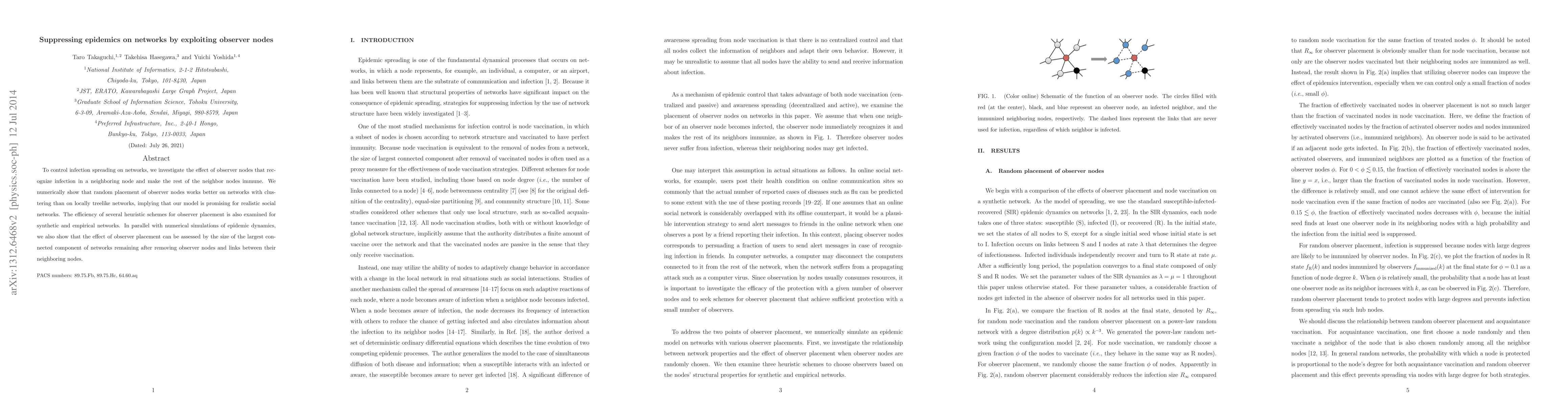 To control infection spreading on networks, we investigate the effect of observer nodes that recognize infection in a neighboring node and make the rest of the neighbor nodes immune. We numerically show that random placement of observer nodes works better on networks with clustering than on locally treelike networks, implying that our model is promising for realistic social networks. The efficiency of several heuristic schemes for observer placement is also examined for synthetic and empirical networks. In parallel with numerical simulations of epidemic dynamics, we also show that the effect of observer placement can be assessed by the size of the largest connected component of networks remaining after removing observer nodes and links between their neighboring nodes.
