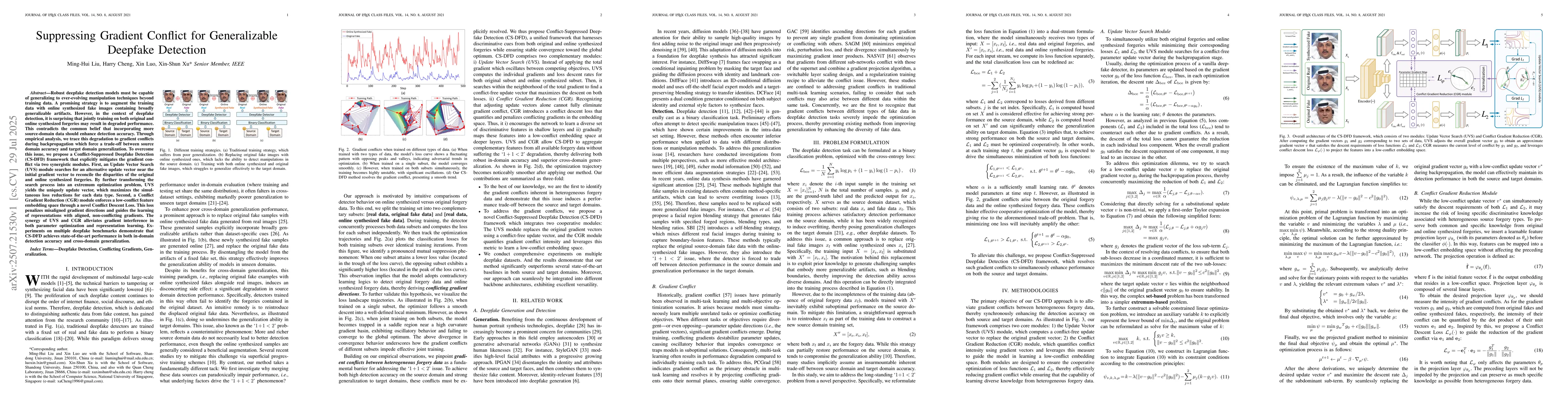Robust deepfake detection models must be capable of generalizing to ever-evolving manipulation techniques beyond training data. A promising strategy is to augment the training data with online synthesized fake images containing broadly generalizable artifacts. However, in the context of deepfake detection, it is surprising that jointly training on both original and online synthesized forgeries may result in degraded performance. This contradicts the common belief that incorporating more source-domain data should enhance detection accuracy. Through empirical analysis, we trace this degradation to gradient conflicts during backpropagation which force a trade-off between source domain accuracy and target domain generalization. To overcome this issue, we propose a Conflict-Suppressed Deepfake Detection (CS-DFD) framework that explicitly mitigates the gradient conflict via two synergistic modules. First, an Update Vector Search (UVS) module searches for an alternative update vector near the initial gradient vector to reconcile the disparities of the original and online synthesized forgeries. By further transforming the search process into an extremum optimization problem, UVS yields the uniquely update vector, which maximizes the simultaneous loss reductions for each data type. Second, a Conflict Gradient Reduction (CGR) module enforces a low-conflict feature embedding space through a novel Conflict Descent Loss. This loss penalizes misaligned gradient directions and guides the learning of representations with aligned, non-conflicting gradients. The synergy of UVS and CGR alleviates gradient interference in both parameter optimization and representation learning. Experiments on multiple deepfake benchmarks demonstrate that CS-DFD achieves state-of-the-art performance in both in-domain detection accuracy and cross-domain generalization.