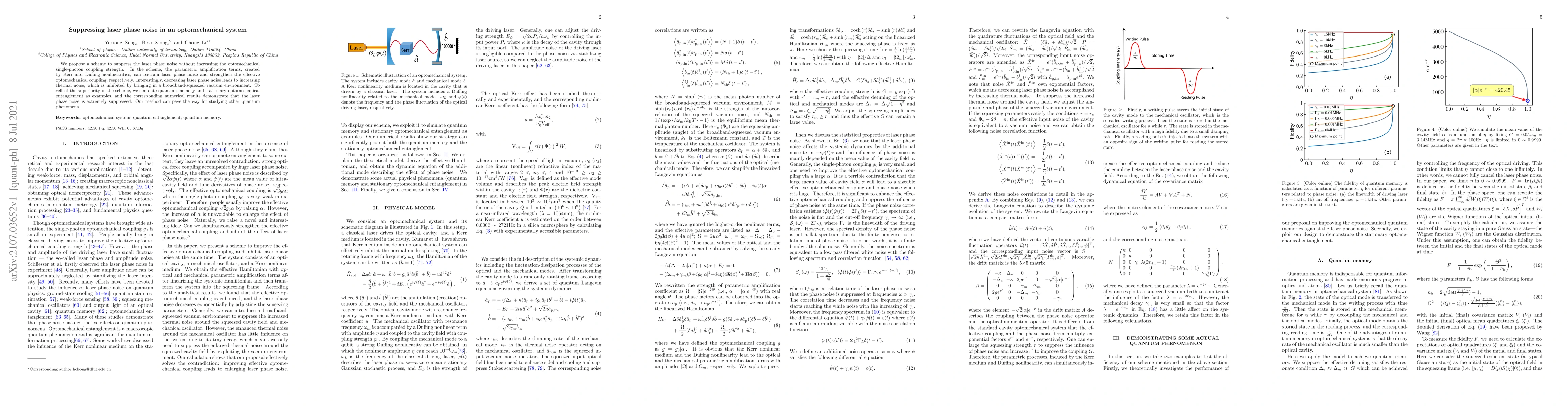 This paper proposes a method to reduce laser phase noise in optomechanical systems using parametric amplification from Kerr and Duffing nonlinearities, while maintaining single-photon coupling strength. The scheme also incorporates broadband-squeezed vacuum to counteract increased thermal noise, demonstrating effectiveness through simulations of quantum memory and optomechanical entanglement.