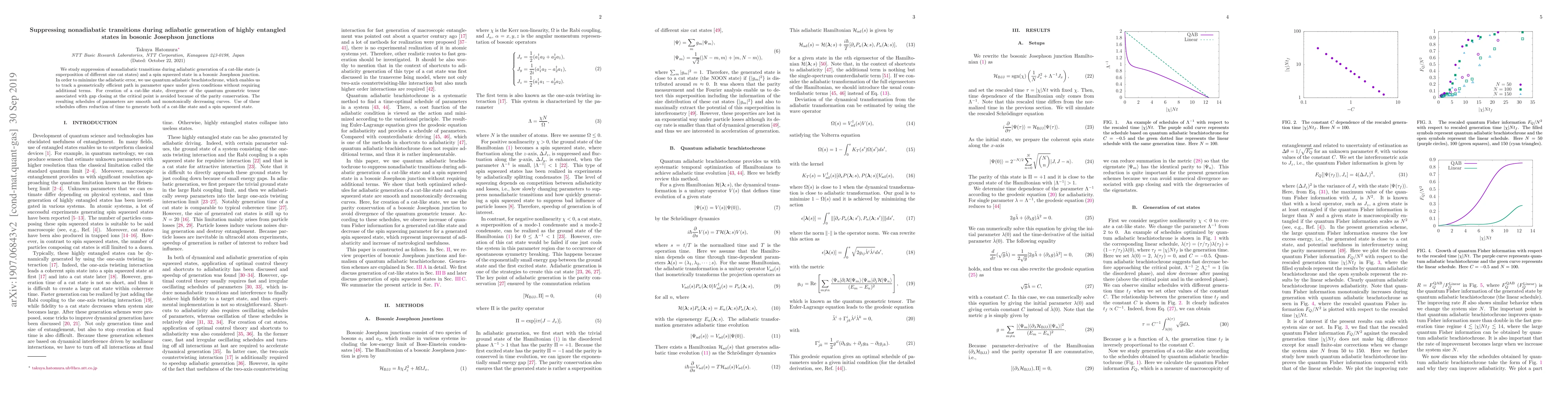 This paper investigates methods to suppress nonadiabatic transitions during the adiabatic generation of entangled states in bosonic Josephson junctions, employing quantum adiabatic brachistochrone to track efficient paths. It finds that using smooth, monotonically decreasing parameter schedules minimizes adiabatic errors and reduces generation time for cat-like and spin squeezed states.