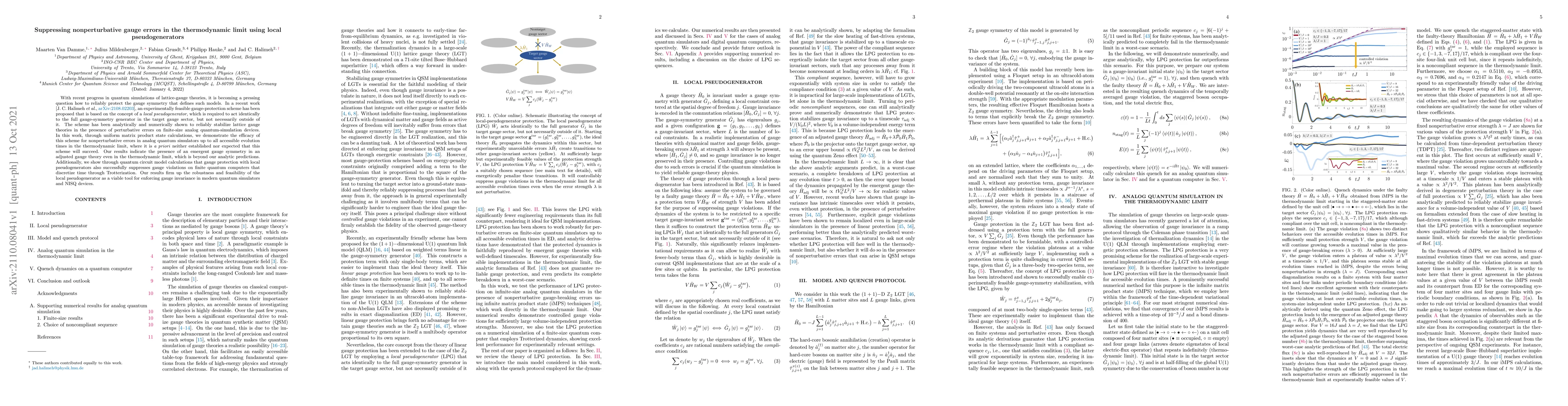 This paper demonstrates the effectiveness of local pseudogenerators in suppressing nonperturbative gauge errors in lattice-gauge theories, showing their success in both the thermodynamic limit and on finite quantum computers using Trotterization. The study confirms the robustness of this method for maintaining gauge invariance in quantum simulations.