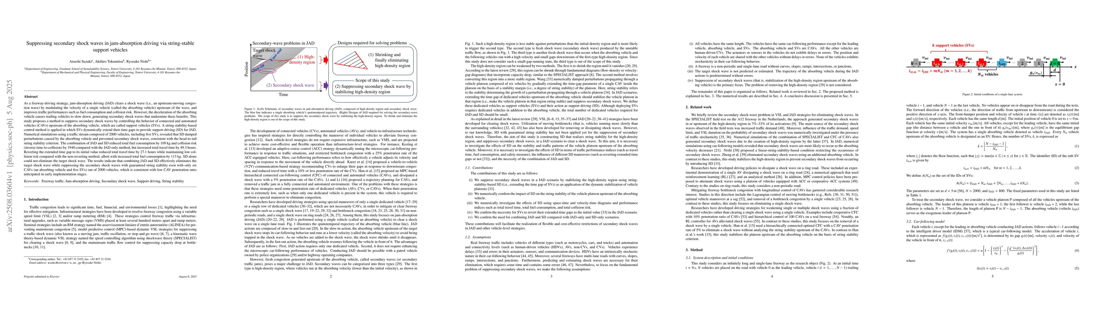 As a freeway-driving strategy, jam-absorption driving (JAD) clears a shock wave (i.e., an upstream-moving congestion wave) by modulating the velocity of a single vehicle (called the absorbing vehicle) upstream of the wave, and improves traffic performances such as fuel consumption and collision risk. However, the deceleration of the absorbing vehicle causes trailing vehicles to slow down, generating secondary shock waves that undermine these benefits. This study proposes a method to suppress secondary shock waves by controlling the behavior of connected and automated vehicles (CAVs) upstream of the absorbing vehicle, which are called support vehicles (SVs). A string-stability-based control method is applied in which SVs dynamically extend their time gaps to provide support driving (SD) for JAD. Numerical simulations using a traffic stream composed of 2000 vehicles, including five SVs, revealed that SD damped perturbations caused by the absorbing vehicle and prevented secondary shock waves, consistent with the head-to-tail string stability criterion. The combination of JAD and SD reduced total fuel consumption by 109 kg and collision risk (inverse time-to-collision) by 1940 compared with the JAD-only method, but increased total travel time by 49.3 hours. Reverting the extended time gap to its initial value reduced total travel time by 27.1 hours while maintaining low collision risk compared with the non-reverting method, albeit with increased total fuel consumption by 113 kg. SD alone could not eliminate the target shock wave. The results indicate that combining JAD and SD effectively eliminates the target shock wave while suppressing the secondary shock waves with guaranteed string stability even with only six CAVs (an absorbing vehicle and five SVs) out of 2000 vehicles, which is consistent with low CAV penetration rates anticipated in early implementation stages.