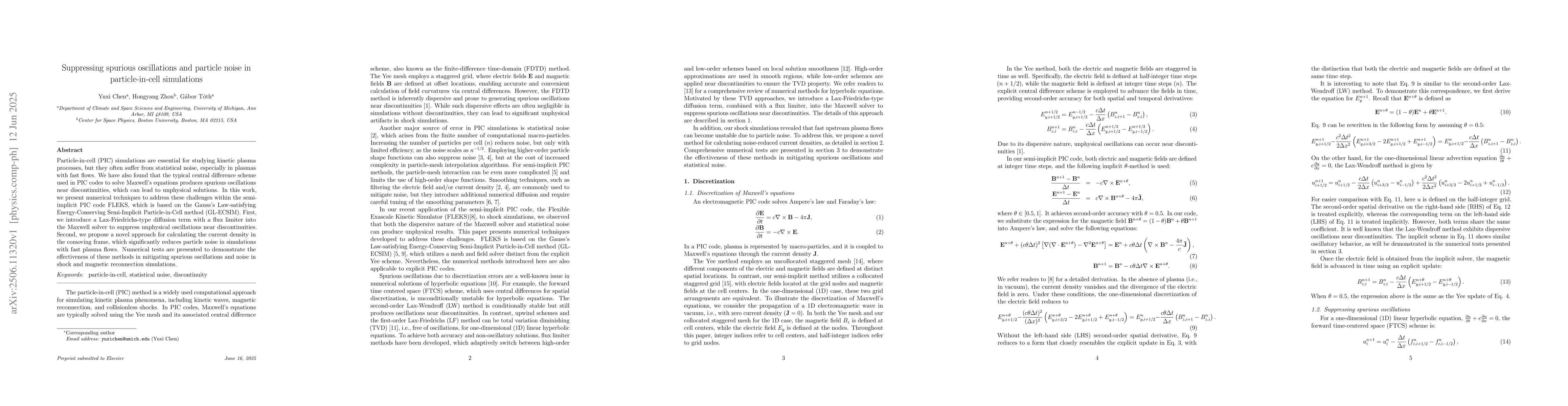 Particle-in-cell (PIC) simulations are essential for studying kinetic plasma processes, but they often suffer from statistical noise, especially in plasmas with fast flows. We have also found that the typical central difference scheme used in PIC codes to solve Maxwell's equations produces spurious oscillations near discontinuities, which can lead to unphysical solutions. In this work, we present numerical techniques to address these challenges within the semi-implicit PIC code FLEKS, which is based on the Gauss's Law-satisfying Energy-Conserving Semi-Implicit Particle-in-Cell method (GL-ECSIM). First, we introduce a Lax-Friedrichs-type diffusion term with a flux limiter into the Maxwell solver to suppress unphysical oscillations near discontinuities. Second, we propose a novel approach for calculating the current density in the comoving frame, which significantly reduces particle noise in simulations with fast plasma flows. Numerical tests are presented to demonstrate the effectiveness of these methods in mitigating spurious oscillations and noise in shock and magnetic reconnection simulations.