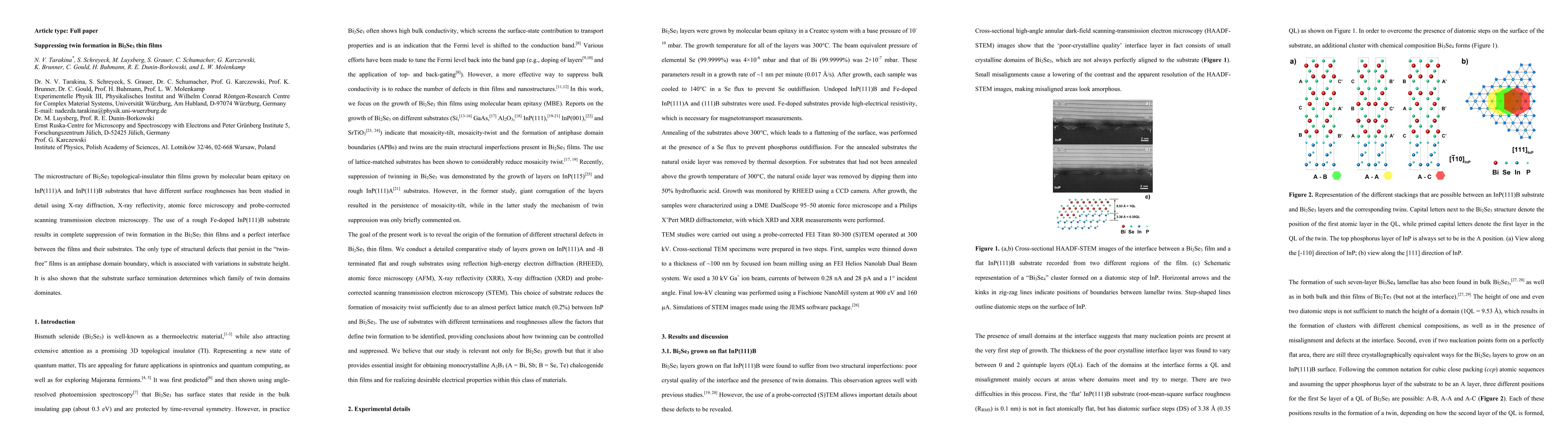This study investigates the microstructure of Bi2Se3 thin films grown on differently roughened InP substrates, revealing that using a rough Fe-doped InP(111)B substrate suppresses twin formation, resulting in a perfect film-substrate interface and minimal structural defects. The substrate surface termination influences the dominant twin domain family.