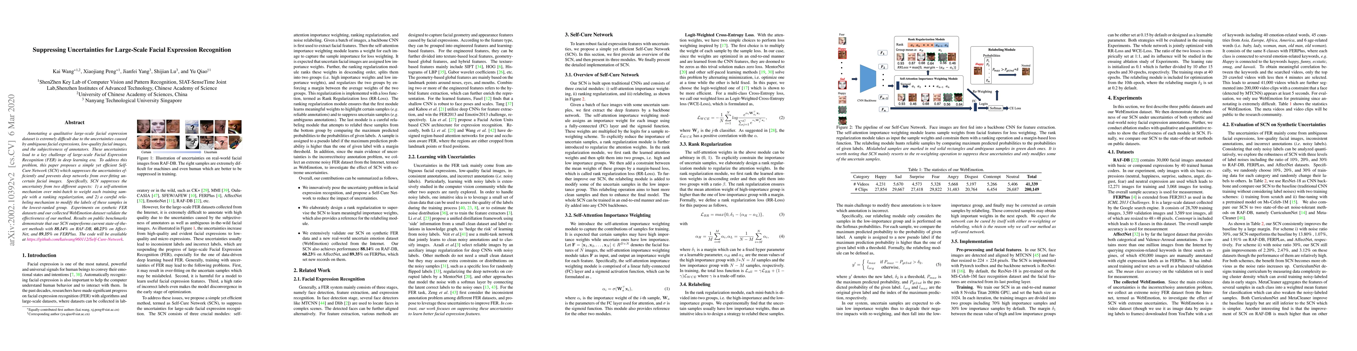 This paper proposes a Self-Cure Network (SCN) to tackle uncertainties in large-scale facial expression recognition, employing a self-attention mechanism and a relabeling strategy to mitigate overfitting. The SCN achieves superior performance on multiple benchmarks, outperforming current state-of-the-art methods.