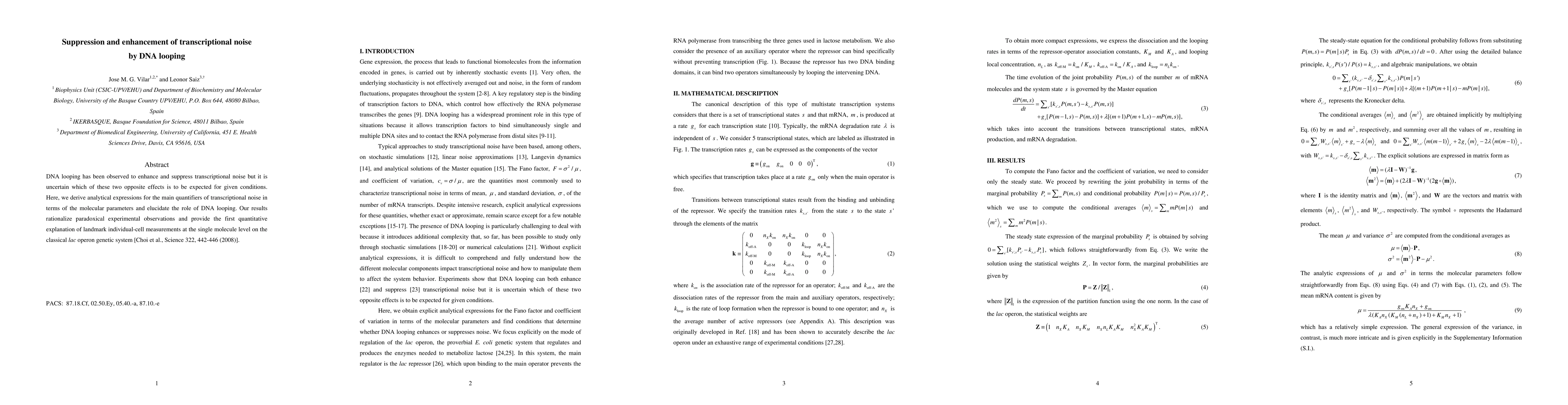 This paper derives analytical expressions to quantify transcriptional noise in relation to DNA looping, explaining how looping can both enhance and suppress noise depending on molecular parameters. The study rationalizes experimental observations and provides a quantitative explanation for single-molecule measurements on the lac operon system.