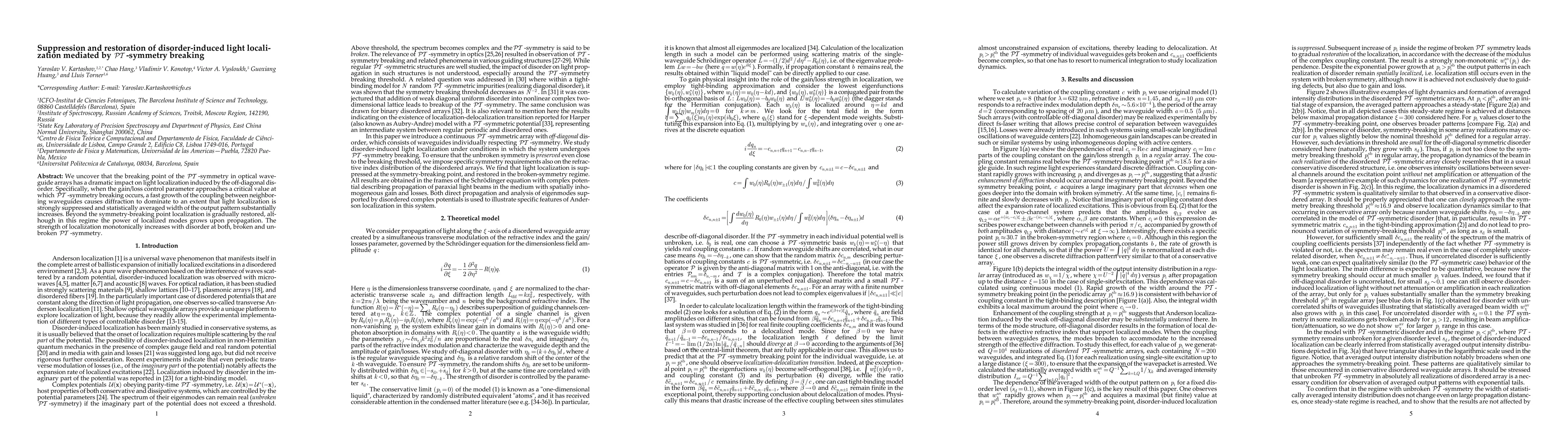 This paper investigates how PT-symmetry breaking in optical waveguide arrays affects disorder-induced light localization. It finds that near the PT-symmetry breaking point, light localization is strongly suppressed due to increased coupling between waveguides, but localization gradually returns beyond this point, though with growing localized mode power.