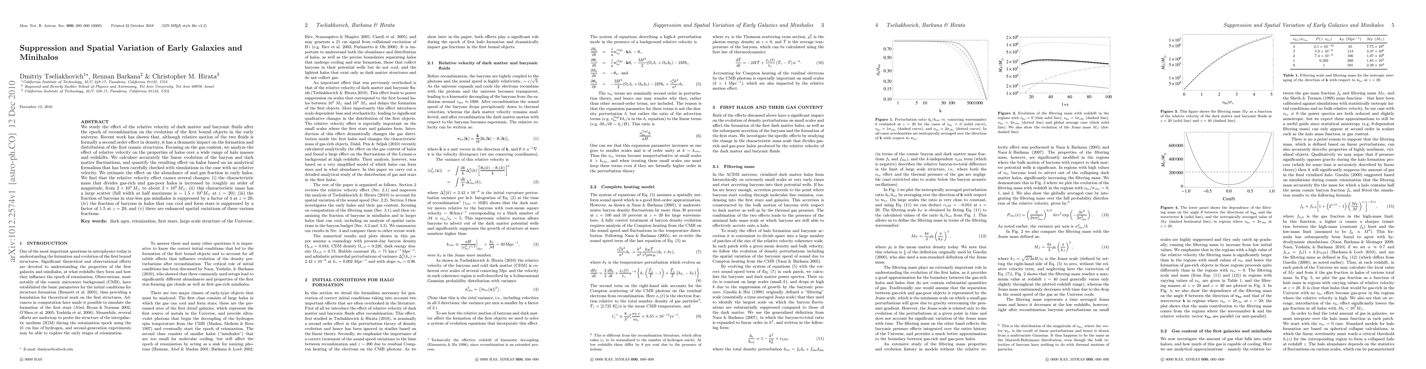 We study the effect of the relative velocity of dark matter and baryonic fluids after the epoch of recombination on the evolution of the first bound objects in the early universe. Recent work has shown that, although relative motion of the two fluids is formally a second order effect in density, it has a dramatic impact on the formation and distribution of the first cosmic structures. Focusing on the gas content, we analyze the effect of relative velocity on the properties of halos over a wide range of halo masses and redshifts. We calculate accurately the linear evolution of the baryon and dark matter fluctuations, and quantify the resulting effect on halos based on an analytical formalism that has been carefully checked with simulations in the case with no relative velocity. We estimate the effect on the abundance of and gas fraction in early halos. We find that the relative velocity effect causes several changes: (i) the characteristic mass that divides gas-rich and gas-poor halos is increased by roughly an order of magnitude, from 2 10^4 Msun to about 2 10^5 Msun; (ii) this characteristic mass has a large scatter (full width at half maximum is ~ 1.5 10^5 Msun at z=20); (iii) the fraction of baryons in star-less gas minihalos is suppressed by a factor of 4 at z=20; (iv) the fraction of baryons in halos that can cool and form stars is suppressed by a factor of 1.5 at z=20; and (v) there are enhanced spatial variations of these various fractions.