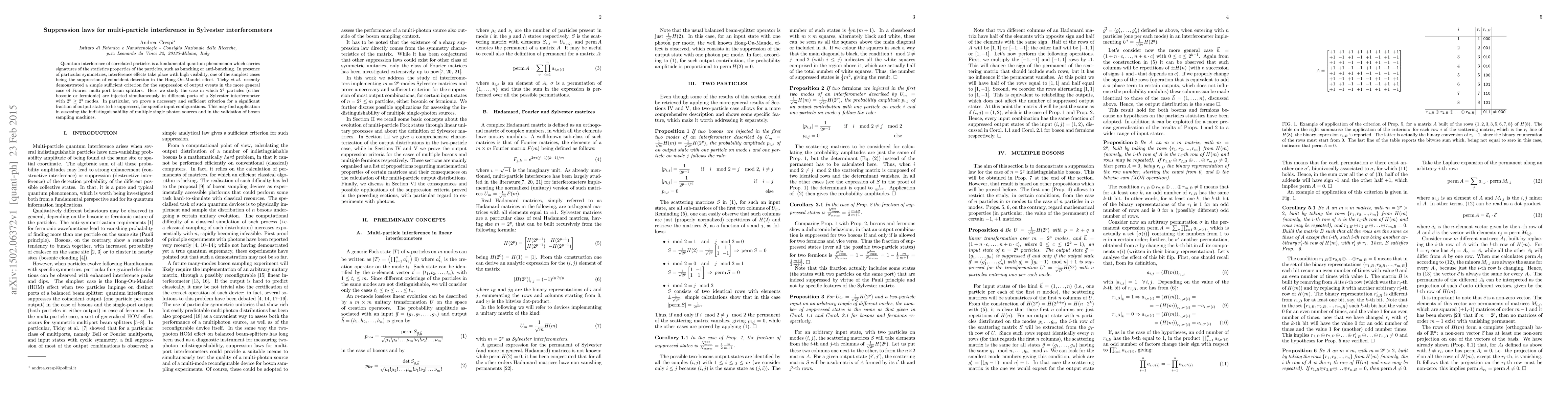 This paper investigates the suppression of multi-particle interference in Sylvester interferometers, proving a necessary and sufficient criterion for significant output state suppression under specific input conditions. This research has implications for evaluating the indistinguishability of multiple photon sources and validating boson sampling machines.