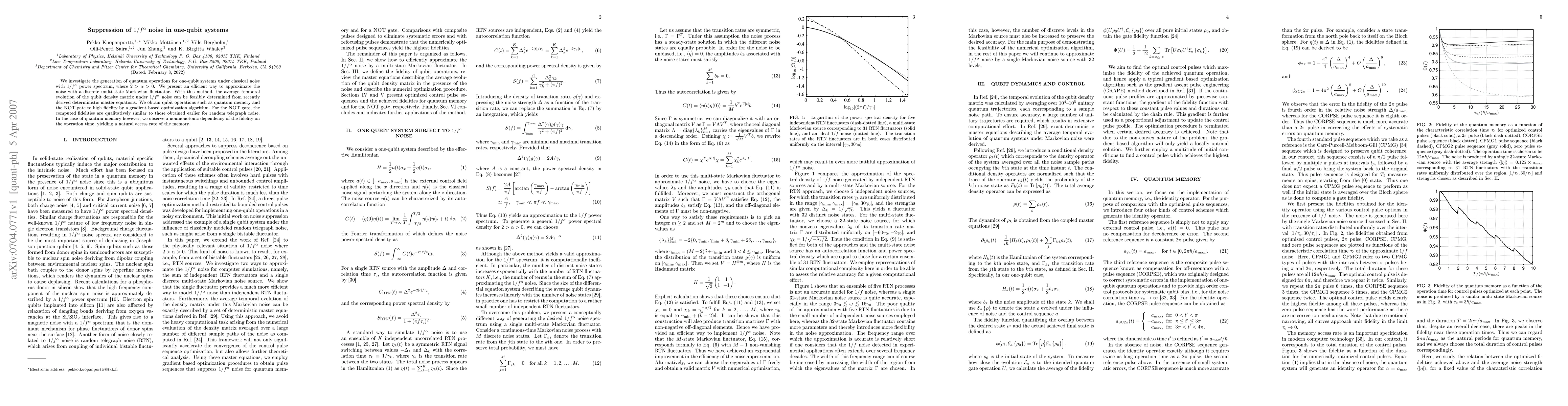 This research develops a method to approximate 1/f noise in one-qubit systems using a discrete multi-state Markovian fluctuator, enabling high-fidelity quantum operations such as quantum memory and the NOT gate via gradient-based optimization. The study reveals a nonmonotonic fidelity dependency for quantum memory, indicating a natural access rate.