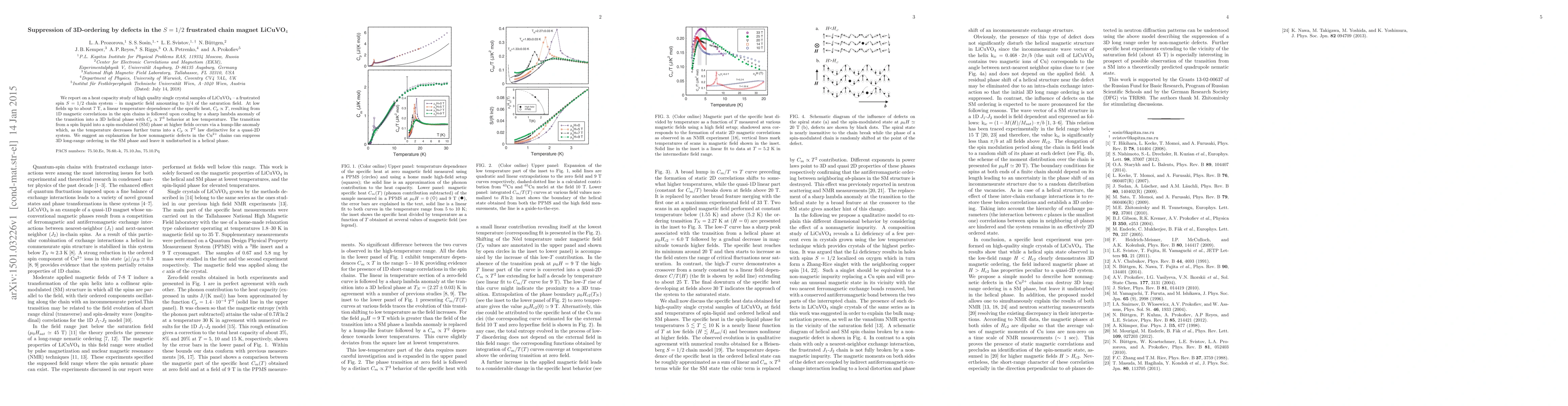 Researchers studied heat capacity in a frustrated spin chain magnet, finding that defects suppress 3D-ordering and instead lead to a quasi-2D behavior at lower temperatures.