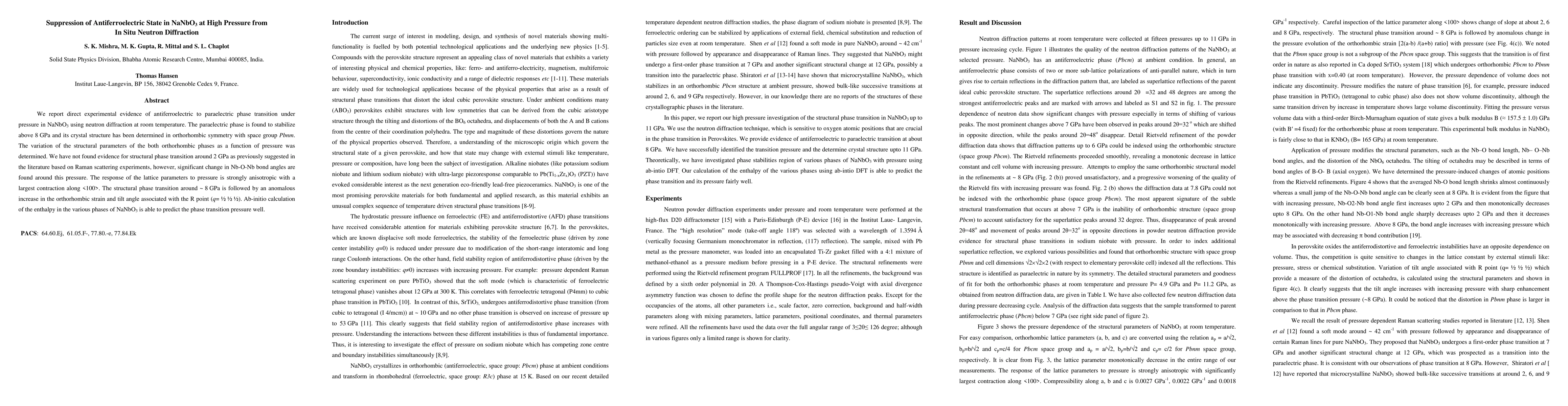 This study provides direct evidence of an antiferroelectric to paraelectric phase transition in NaNbO3 under high pressure using neutron diffraction, finding stabilization of the paraelectric phase above 8 GPa in orthorhombic symmetry. The study also reveals significant changes in Nb-O-Nb bond angles around 2 GPa and anisotropic lattice contraction, with ab-initio calculations corroborating the observed phase transition.