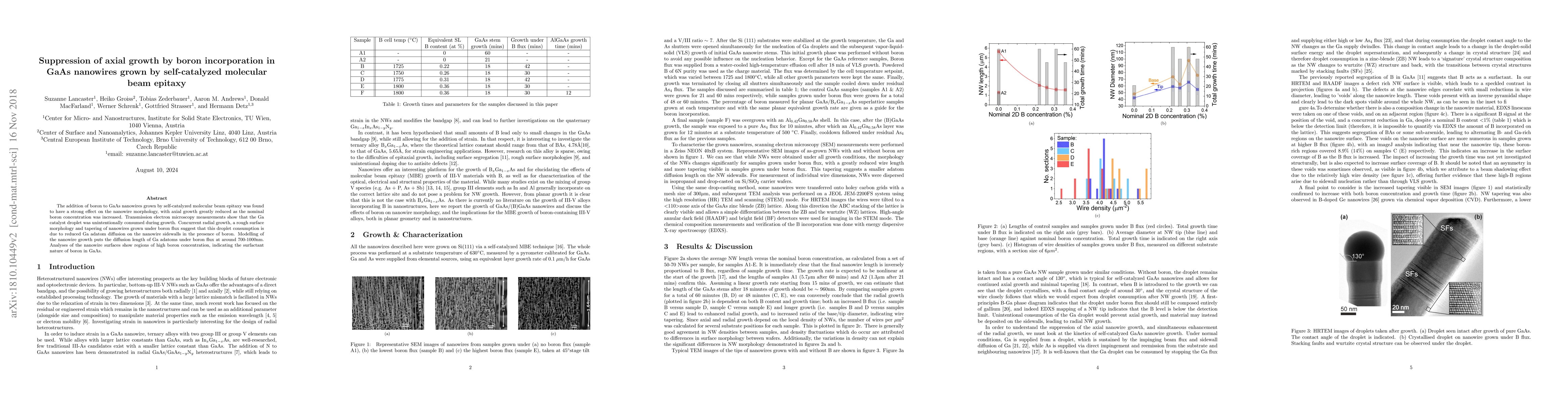 This study demonstrates that boron incorporation significantly suppresses axial growth in GaAs nanowires grown via self-catalyzed molecular beam epitaxy, leading to radial growth, rough surface morphology, and tapering. The reduced Ga adatom diffusion in the presence of boron suggests the surfactant nature of boron, affecting the catalyst droplet consumption and growth dynamics.