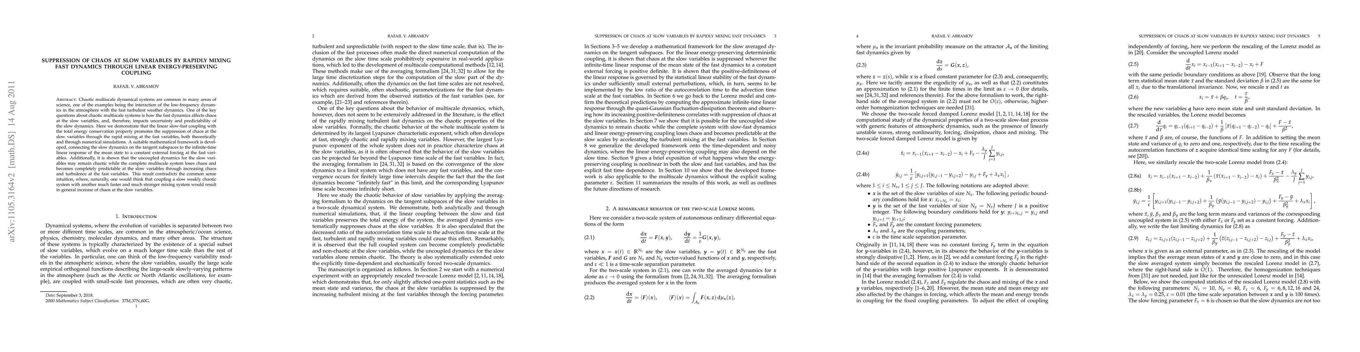 This paper demonstrates that linear energy-preserving coupling between fast and slow dynamics in chaotic multiscale systems can suppress chaos in the slow variables by promoting rapid mixing in the fast dynamics. This counterintuitive result is shown both theoretically and through numerical simulations.