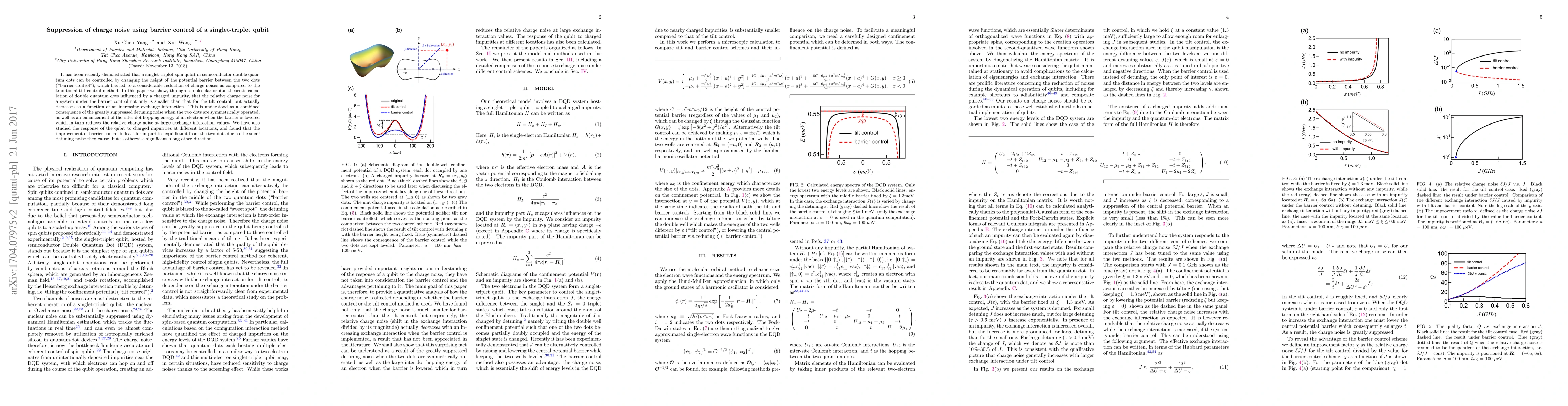 This paper demonstrates that "barrier control" of a singlet-triplet spin qubit in semiconductor double quantum dots significantly reduces charge noise compared to traditional "tilt control," with the noise decreasing further as the exchange interaction increases. The improvement is attributed to reduced detuning noise and enhanced inter-dot electron hopping energy.