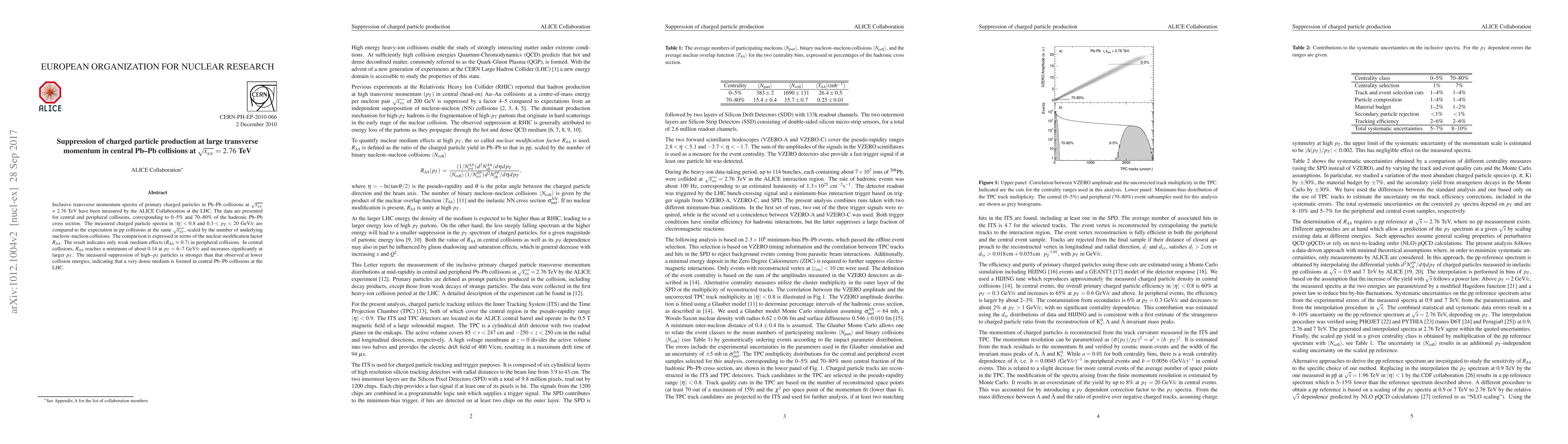 The ALICE Collaboration measured charged particle production in Pb-Pb collisions at $\sqrt{s_{\rm NN}} = 2.76$ TeV, showing a significant suppression of high-$p_T$ particles in central collisions compared to peripheral ones. The nuclear modification factor $R_{\rm AA}$ indicates a minimum value of about 0.14 at $p_{\rm T}=6$-7 GeV/$c$, suggesting a dense medium formation at these energies.