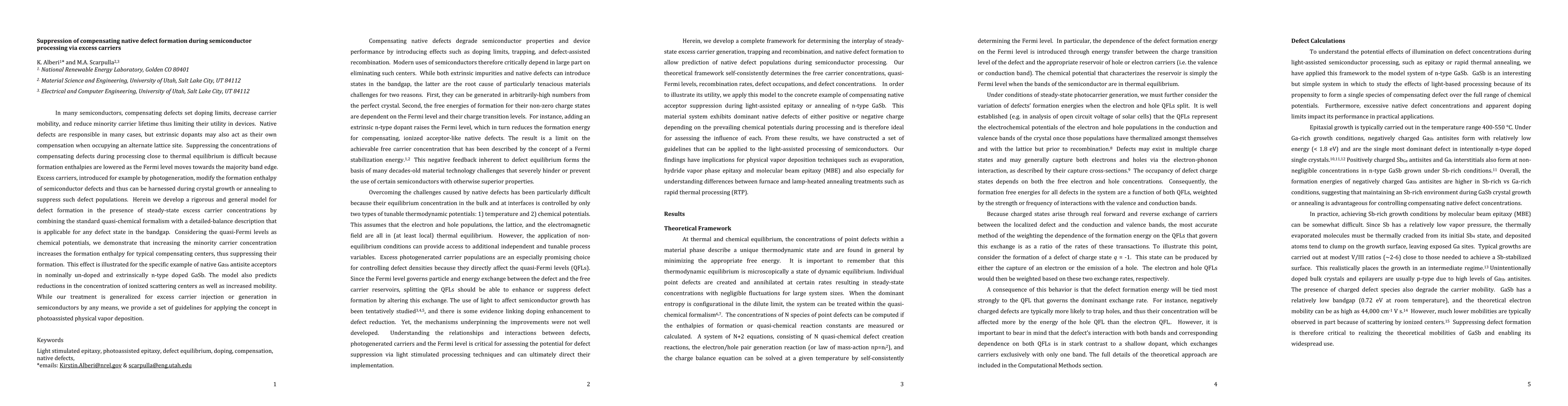 This paper develops a model to suppress compensating native defect formation in semiconductors by introducing excess carriers, which increases the formation enthalpy of defects and reduces their concentration.