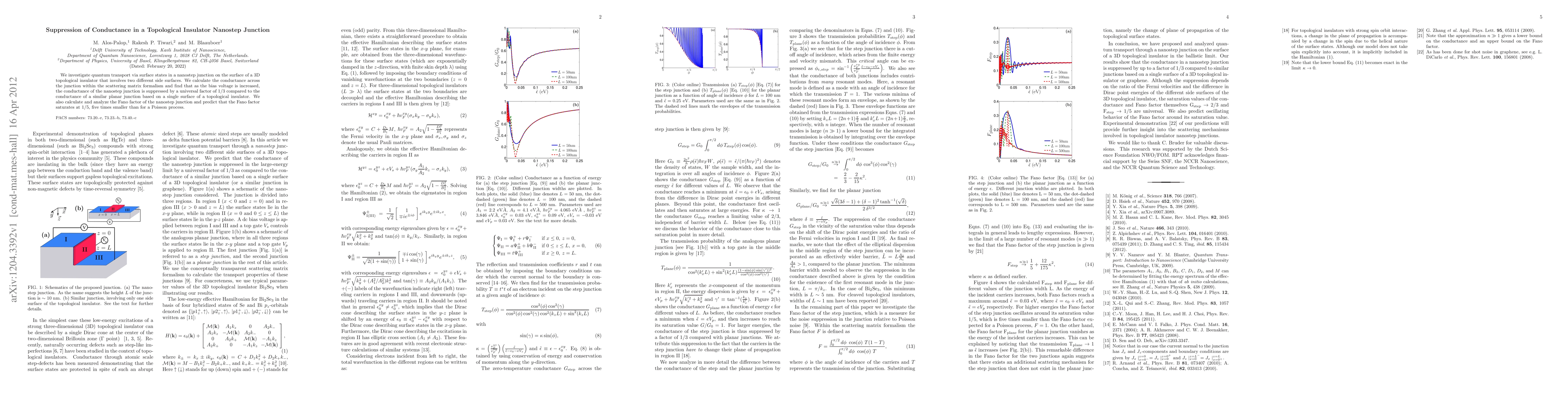This study examines quantum transport through surface states in a topological insulator nanostep junction, revealing that conductance is suppressed by a factor of 1/3 with increased bias voltage compared to a planar junction. The Fano factor is predicted to saturate at 1/5, significantly lower than a Poisson process.