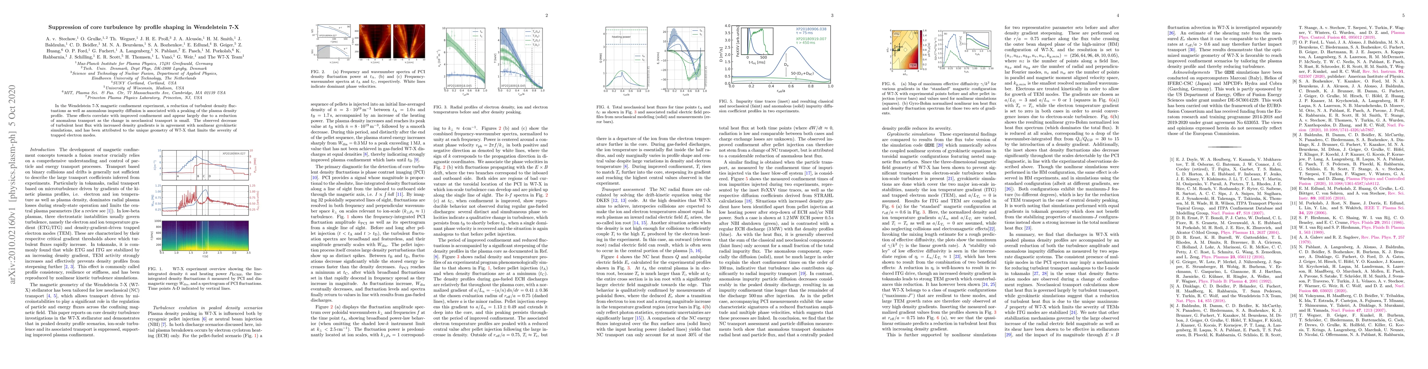 The Wendelstein 7-X experiment demonstrates that shaping the plasma density profile to create peaking reduces turbulent density fluctuations and anomalous impurity diffusion, leading to improved confinement. This effect is primarily due to decreased anomalous transport, corroborated by nonlinear gyrokinetic simulations.