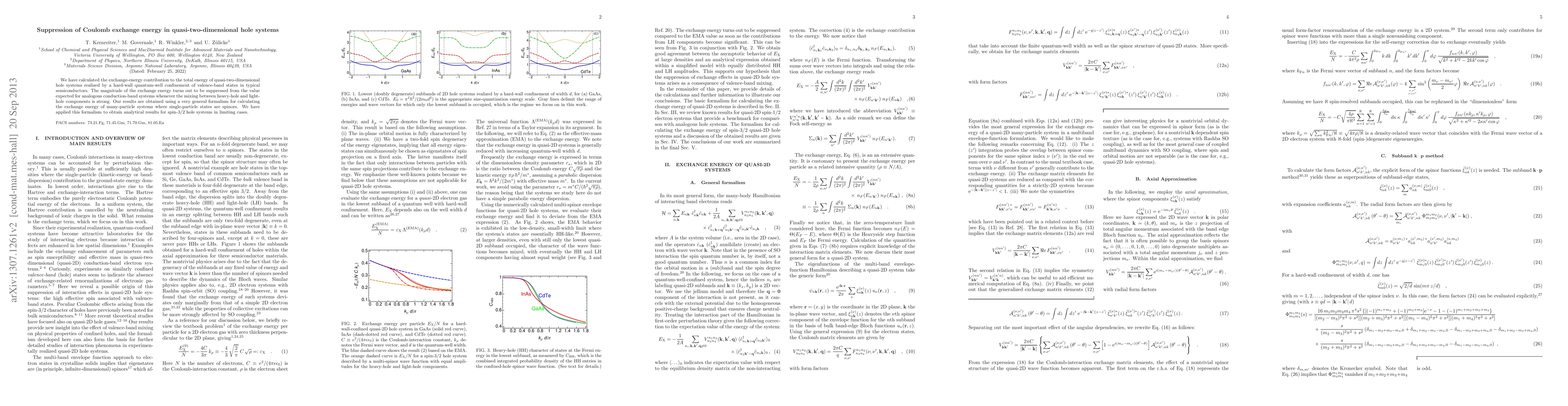 We have calculated the exchange-energy contribution to the total energy of quasi-two-dimensional hole systems realized by a hard-wall quantum-well confinement of valence-band states in typical semiconductors. The magnitude of the exchange energy turns out to be suppressed from the value expected for analogous conduction-band systems whenever the mixing between heavy-hole and light-hole components is strong. Our results are obtained using a very general formalism for calculating the exchange energy of many-particle systems where single-particle states are spinors. We have applied this formalism to obtain analytical results for spin-3/2 hole systems in limiting cases.