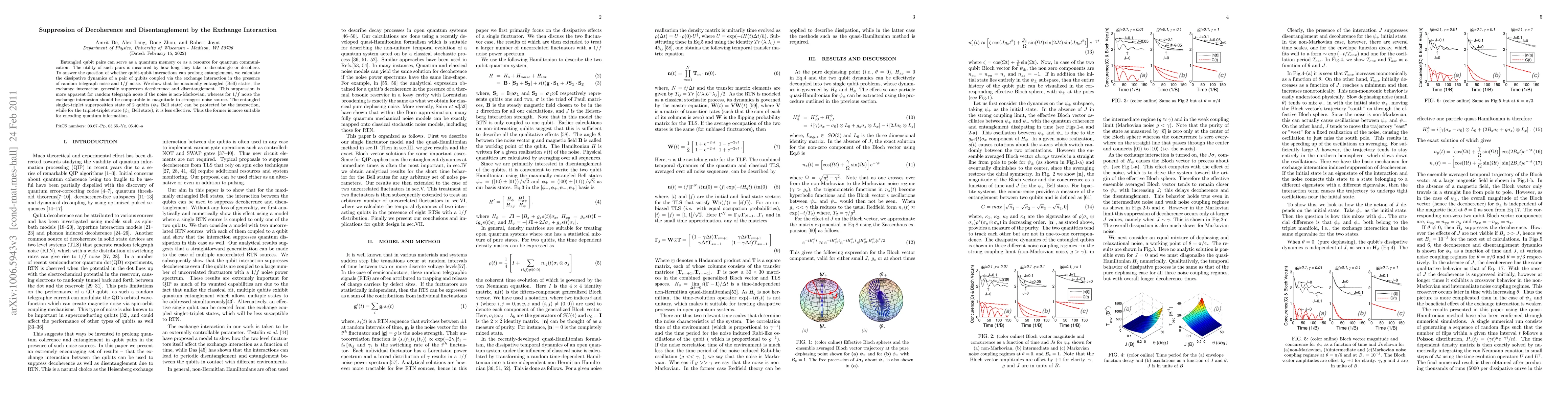 This paper investigates how qubit-qubit exchange interactions affect the decoherence and disentanglement of entangled qubit pairs under various noise conditions. It finds that the exchange interaction generally suppresses decoherence, especially for non-Markovian random telegraph noise, and is effective in protecting the entangled singlet-triplet superposition state ($\psi_{\pm}$) for quantum information encoding.