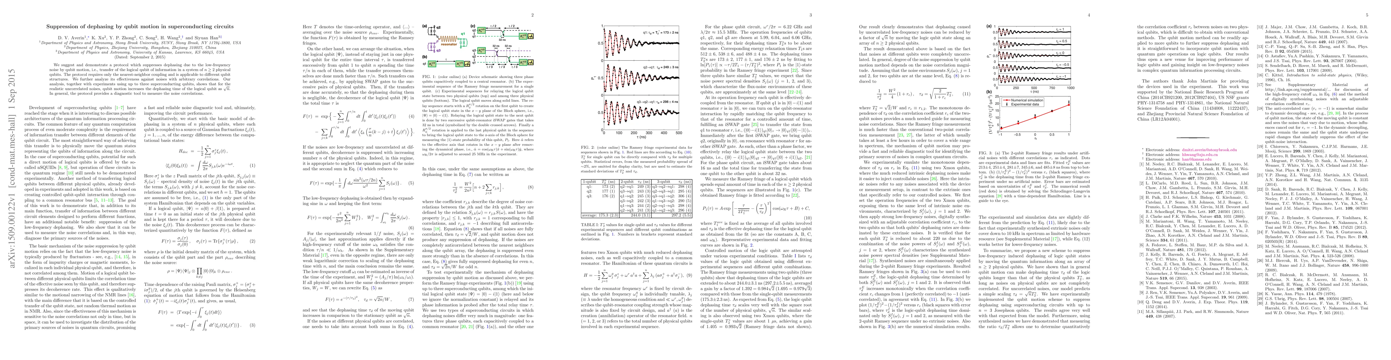 This paper proposes a protocol to suppress dephasing in superconducting qubits through their motion, enhancing the coherence time of logical qubits by $\sqrt{n}$ in systems with $n \geq 2$ physical qubits. The method is effective against various noise correlations and serves as a diagnostic tool for noise measurement.