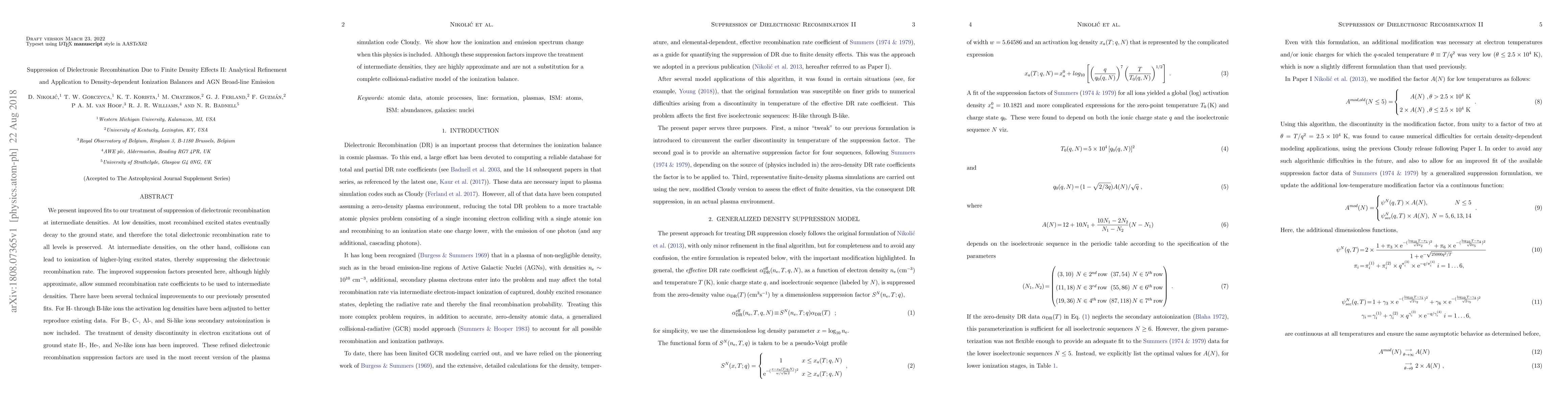 This paper refines the suppression factors for dielectronic recombination at intermediate densities, improving fits for various ions and incorporating secondary autoionization. The refined factors are applied in the plasma simulation code Cloudy to study ionization balances and AGN broad-line emission, though they remain approximations and not replacements for comprehensive models.