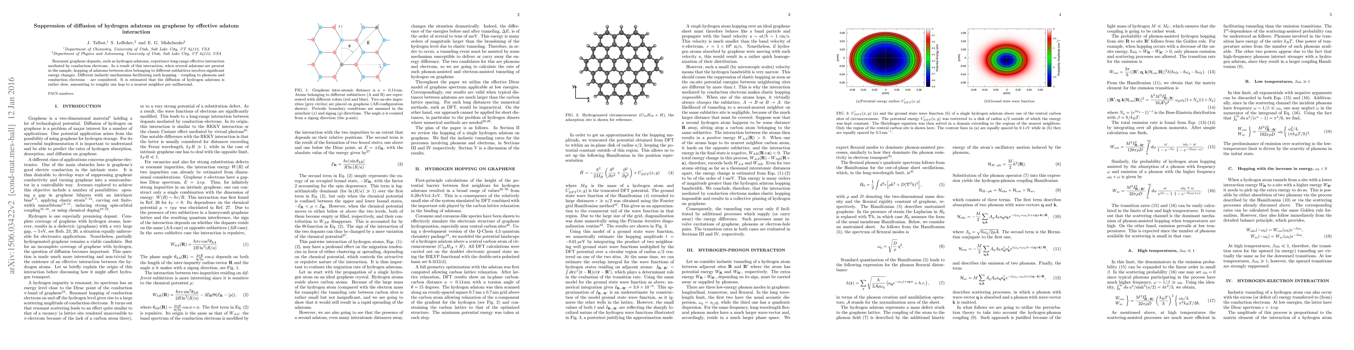 This study investigates how effective interactions mediated by conduction electrons suppress the diffusion of hydrogen adatoms on graphene. It finds that due to these interactions, adatom hopping involves significant energy changes, resulting in a diffusion rate of about one hop per millisecond.