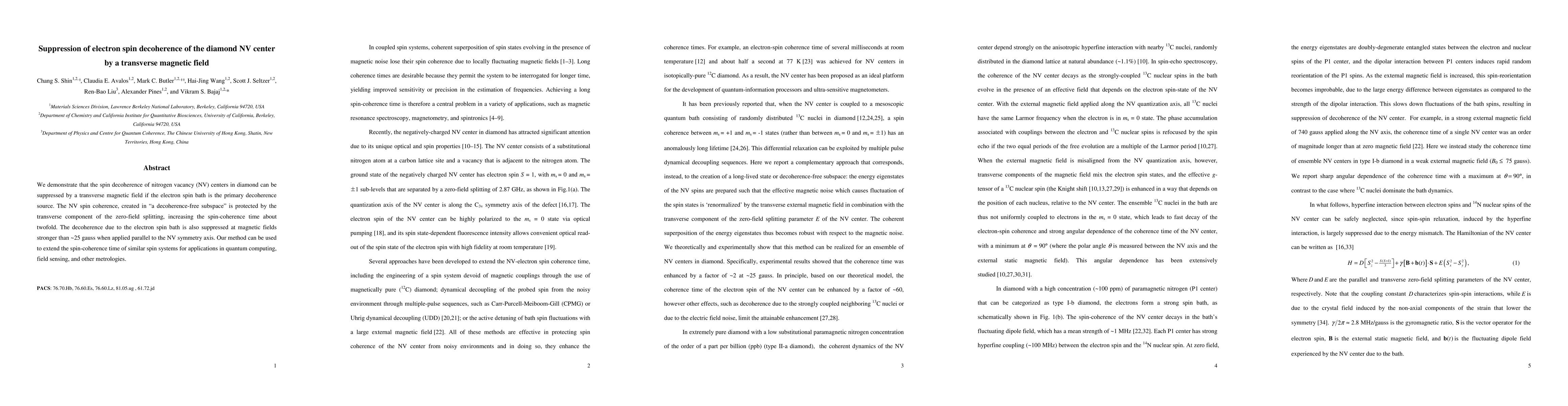 This paper demonstrates that applying a transverse magnetic field can significantly suppress electron spin decoherence in nitrogen vacancy (NV) centers in diamond, doubling the spin-coherence time. This method is effective when the electron spin bath is the primary decoherence source and can enhance coherence for quantum computing and metrology applications.