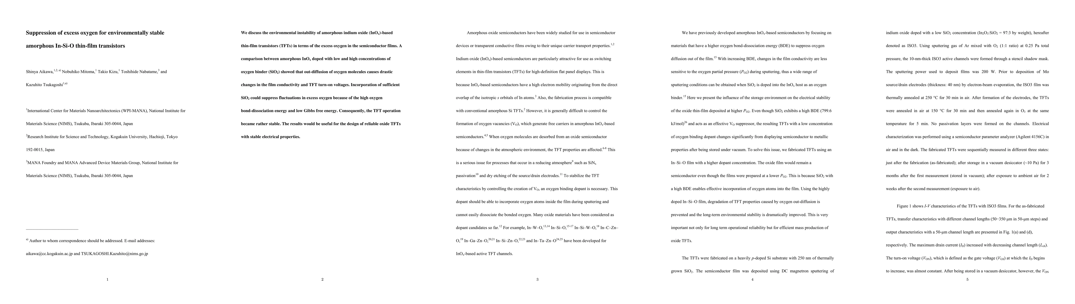 This paper investigates the environmental instability of amorphous InOx-based TFTs due to excess oxygen in the semiconductor films. Incorporating sufficient SiO2 suppresses oxygen out-diffusion, stabilizing TFT operation and improving reliability.