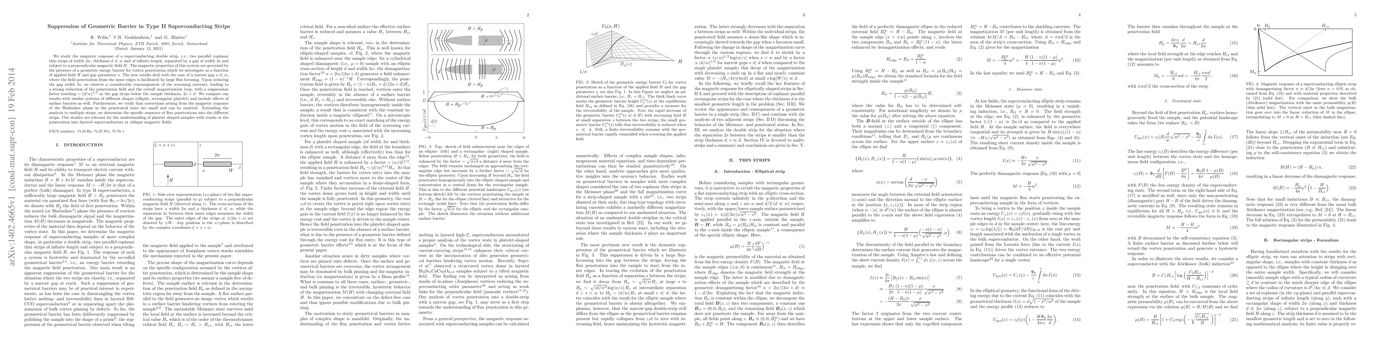 We study the magnetic response of a superconducting double strip, i.e., two parallel coplanar thin strips of width $2w$, thickness $d \ll w$ and of infinite length, separated by a gap of width $2s$ and subject to a perpendicular magnetic field $H$. The magnetic properties of this system are governed by the presence of a geometric energy barrier for vortex penetration which we investigate as a function of applied field $H$ and gap parameter $s$. The new results deal with the case of a narrow gap $s \ll w$, where the field penetration from the inner edges is facilitated by large flux focusing. Upon reducing the gap width $2s$, we observe a considerable rearrangement of the screening currents, leading to a strong reduction of the penetration field and the overall magnetization loop, with a suppression factor reaching $\sim (d/w)^{1/2}$ as the gap drops below the sample thickness, $2s < d$. We compare our results with similar systems of different shapes (elliptic, rectangular platelet) and include effects of surface barriers as well. Furthermore, we verify that corrections arising from the magnetic response of the Shubnikov phase in the penetrated state are small and can be omitted. Extending the analysis to multiple strips, we determine the specific sequence of flux penetrations into the different strips. Our studies are relevant for the understanding of platelet shaped samples with cracks or the penetration into layered superconductors at oblique magnetic fields.