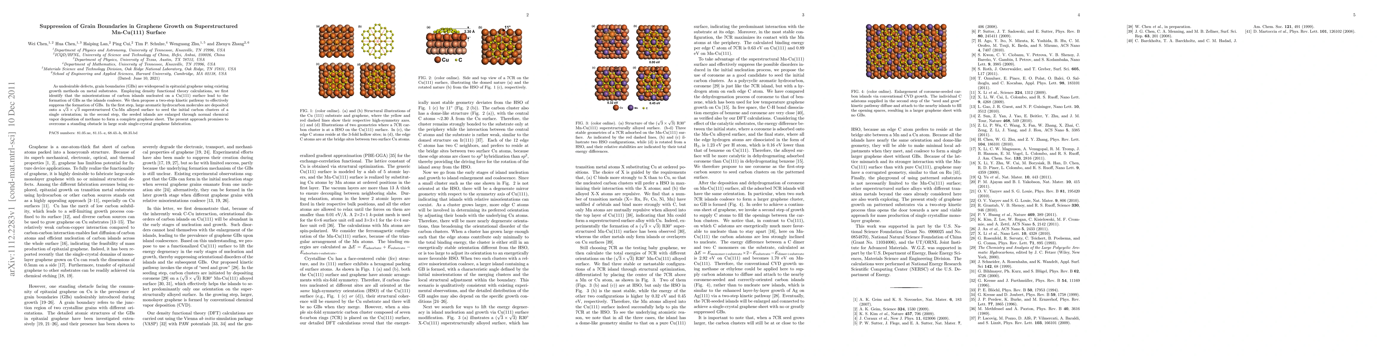 The paper introduces a novel two-step kinetic pathway for suppressing grain boundaries in graphene growth on a superstructured Mn-Cu(111) surface, utilizing large aromatic hydrocarbons for initial cluster seeding and methane CVD for island enlargement.