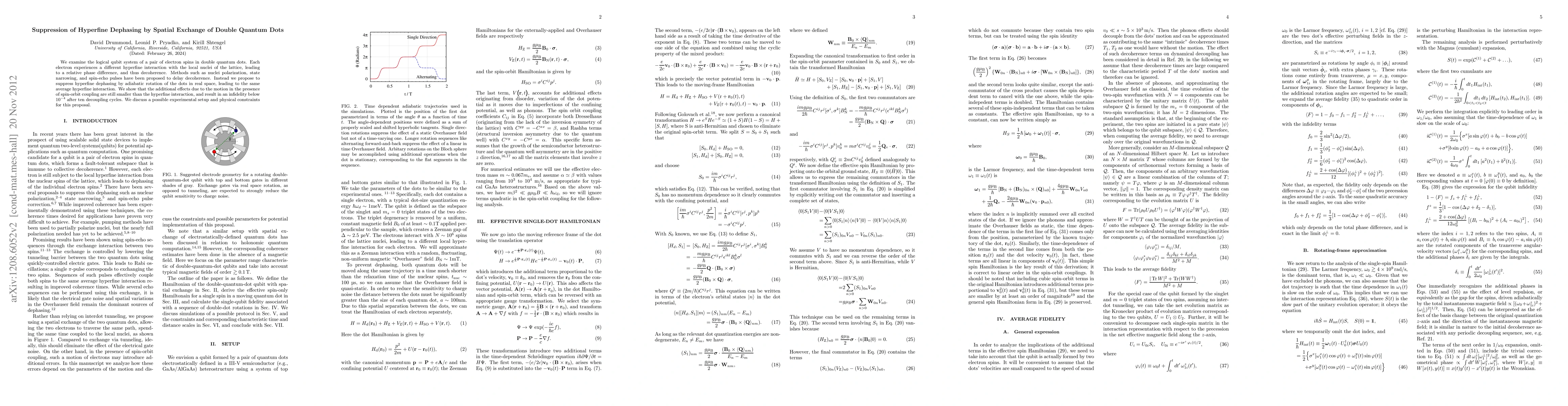 This paper proposes suppressing hyperfine dephasing in a logical qubit system of electron spins in double quantum dots through adiabatic rotation of the dots, achieving an infidelity below 10^{-4} after ten decoupling cycles, demonstrating a novel approach to mitigating decoherence.