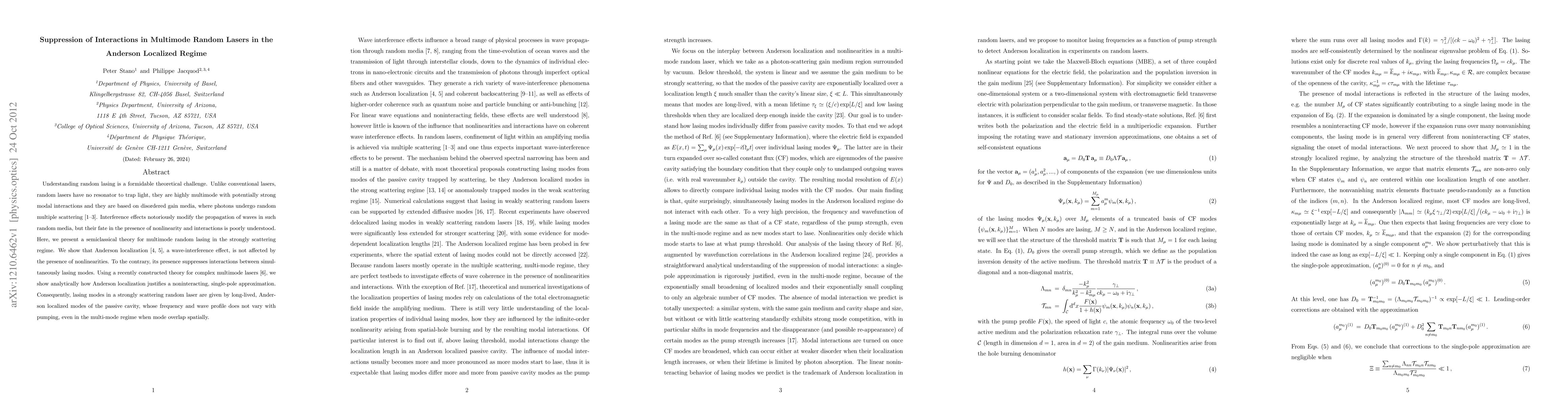 This research develops a semiclassical theory for multimode random lasers in the Anderson localized regime, demonstrating that despite strong modal interactions, nonlinearity and Anderson localization suppress these interactions. The study shows that lasing modes correspond to long-lived, localized modes of the passive cavity unaffected by pumping variations.
